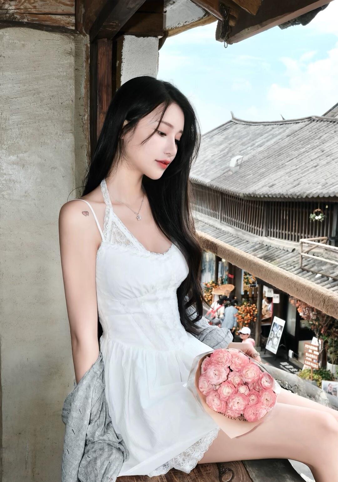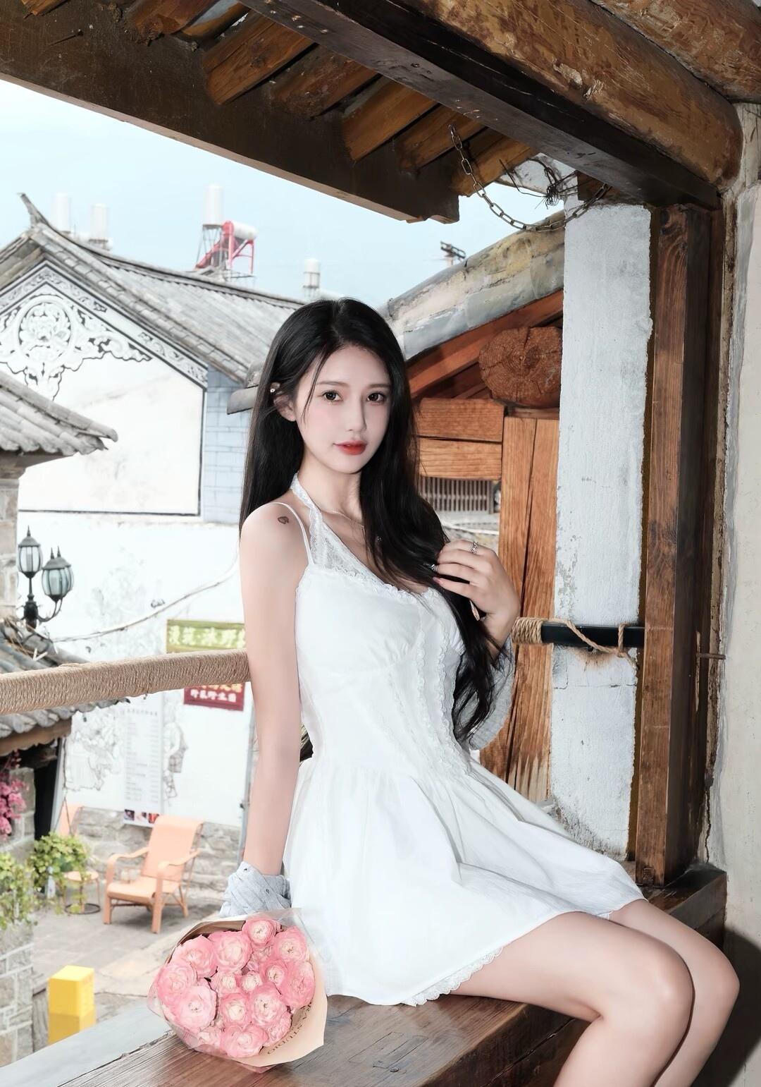 古风少女在木制阳台上,花环点缀,悠然自得。