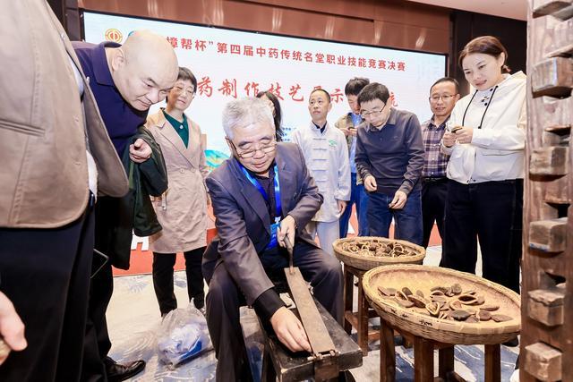 10月30日,在第四届中药传统名堂职业技能竞赛决赛上,选手与嘉宾体验传统中药炮制技艺。新华社发