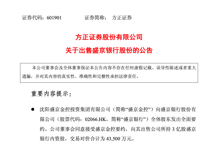 10月30日,方正证券发布公告称,沈阳盛京金控投资集团有限公司向盛京银行全体股东发出全面要约,方正证券董事会同意出售所持3亿股盛京银行内资股,交易对价合计为4.35亿元。