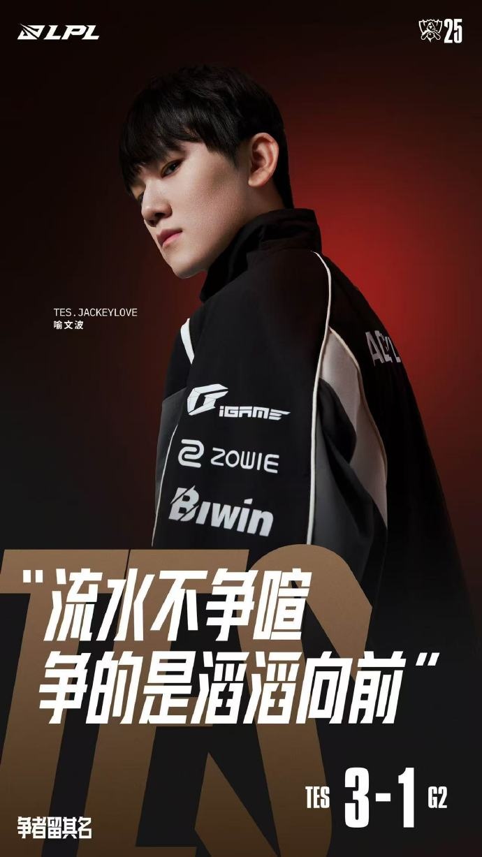LPL官方发布JackeyLove选手海报,配文:流水不争喧,争的是滔滔向前!恭喜滔搏晋级2025全球总决赛淘汰赛半决赛!