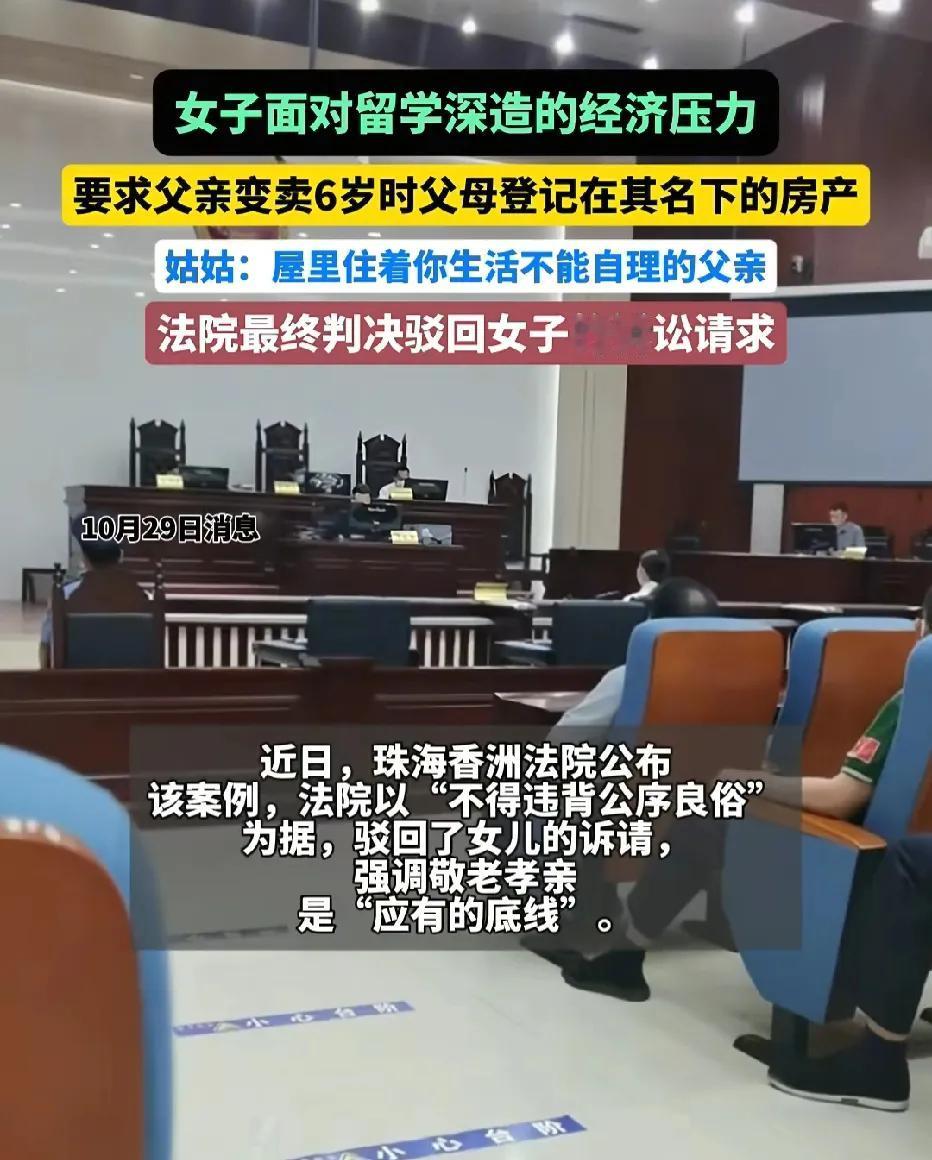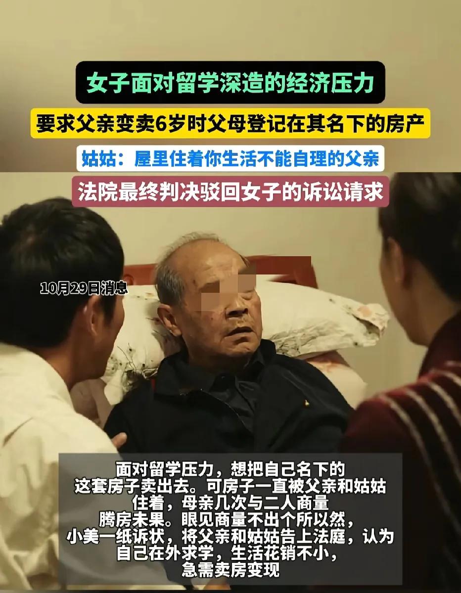 广东珠海,男子和妻子购买一套房子,登记在6岁的女儿名下,后续两人离婚,女儿抚养权归女方所有。多年后女儿长大成人,计划出国留学,为筹措学费决定卖掉房子。不料,该房屋早已被父亲及姑姑入住,女子担忧姑姑会借机侵占房产,女儿也多次要求病重的父亲搬离,却遭父亲以“搬离不利于养病”为由拒绝。协商无果后,女儿选择将父亲和姑姑告上法院,要求腾出房屋,法院这样判了。 据悉,2008年林先生(化名)与陈女士(化名)夫妇买了一套80平方米房子,登记在了年仅6岁的女儿小美名下。 彼时夫妻二人想着,房子是给女儿未来的保障,早早登记在她名下,也能省去日后的诸多麻烦。 2013年,林先生与陈女士感情亮起了红灯,双方签订了离婚协议,小美的抚养权归陈女士所有。 但关于那套登记在小美名下的房子,双方并未过多商议,房子暂时由林先生打理。 后来,小美很少与父亲见面,她跟随母亲生活,住在另一套房子内。 随着时间推移,小美在母亲的悉心照料下长大成人,成绩优异的她收到了国外知名大学的录取通知书。 可出国留学的费用远超普通家庭承受范围。 陈女士独自抚养女儿多年,早已不堪经济重负。 情急之下,小美想起了自己名下的那套80㎡房产,便与母亲商议,决定卖掉房子筹措留学开支。 可当母女俩前往房屋查看时,却发现房子早已被林先生和其妹妹(小美的姑姑)一同入住,屋内堆满了两人的生活用品。 陈女士心里犯了嘀咕:房子登记在女儿名下,姑姑并非产权人,长期居住会不会借机侵占房产? 小美也多次找到父亲,表明自己出国留学开支大,希望父亲和姑姑能尽快搬离,方便房屋挂牌出售。 但林先生此前因脑梗导致二级伤残,常年卧床,身体虚弱。 加上他名下又没其他房产,也没有能力买房或者租房,以此为由拒绝了腾房。 姑姑也站在林先生一边,认为小美不顾父亲病重执意卖房,过于冷漠。 她对小美表示,这房子当初也是你爸妈一起买的,你爸住在这里天经地义,你怎么能为了留学就把他赶出去? 但小美对父亲和姑姑的说法不认同,她觉得姑姑一定趁着父亲病重,无力打理事务的机会,想趁机侵占自己的房产。 面对侄女的质疑,姑姑觉得十分冤枉,反复解释自己只是因为弟弟无人照料,才不定期过来陪护居住,绝无半分侵占房产的念头。 小美始终心存怀疑。 她又和父亲多次沟通协商,始终无法达成一致,可她急需卖房变现。 加上她认为父亲有能力购房和租房,只是他和姑姑联手霸占房产,不愿意腾出房子,所以才不配合她。 无奈之下,小美将父亲和姑姑一同告上了法院,请求法院判令二人立即腾出房屋,归还自己的产权。 出庭那天,姑姑代替了林先生出席,她在法庭上表示,小美告错人了,自己并没有侵占她的房子,只是看在弟弟病重的份上,去照顾一下。而真正居住在那房子的人是小美的父亲。 随后,姑姑向法官提交了林先生的病历、伤残鉴定报告等证据,证明其确实身患重病、无其他居所,恳请法官驳回小美的诉讼请求。 法院怎么判? 《民法典》第8条规定:民事主体从事民事活动,不得违反法律,不得违背公序良俗。 小美在父亲无其他居所且身患重病的情况下,要求其腾房,这一行为违背了公序良俗。 《民法典》第26条规定:成年子女对父母负有赡养、扶助和保护的义务。第一千零六十七条规定,子女对父母有赡养、扶助的义务,子女不履行赡养义务时,无劳动能力或生活困难的父母,有要求子女付给赡养费的权利。 法官经过审理认为,林先生因脑梗导致二级伤残,无其他房产及购房、租房能力,小美作为成年子女,有义务保障父亲的居住和生活需求,其要求父亲腾房的行为违反了法定赡养义务。 小美的父母出资购房登记在小美名下,在父亲出现缺乏劳动能力且无生活来源等特殊情况时,从公平原则出发,可允许父亲合理居住。林先生的现状完全符合此类特殊情形,其居住权应得到优先保障。 综上,法院驳回了小美的诉求。 对此,你怎么看?