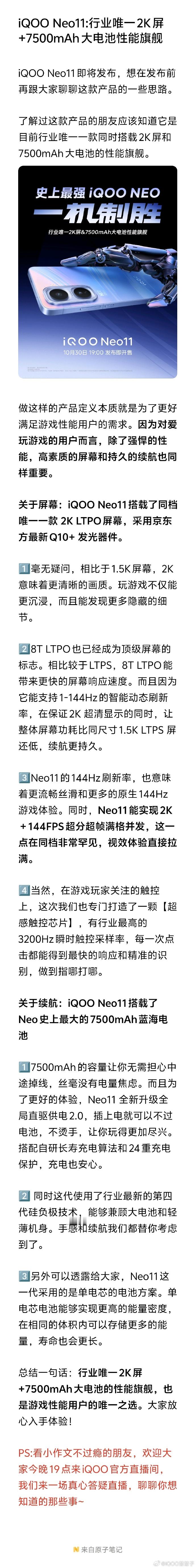 iQOONeo11真2K屏幕一机制胜iQOOneo11.骁龙8至尊强悍的性能。搭载iQOO15同款游戏引擎。同款8k VC散热板。打游戏再也不用担心性能跟不上啦。一机致胜。希望能够早早拿到新机,畅拿我的MVP (小胖聊数码呀)