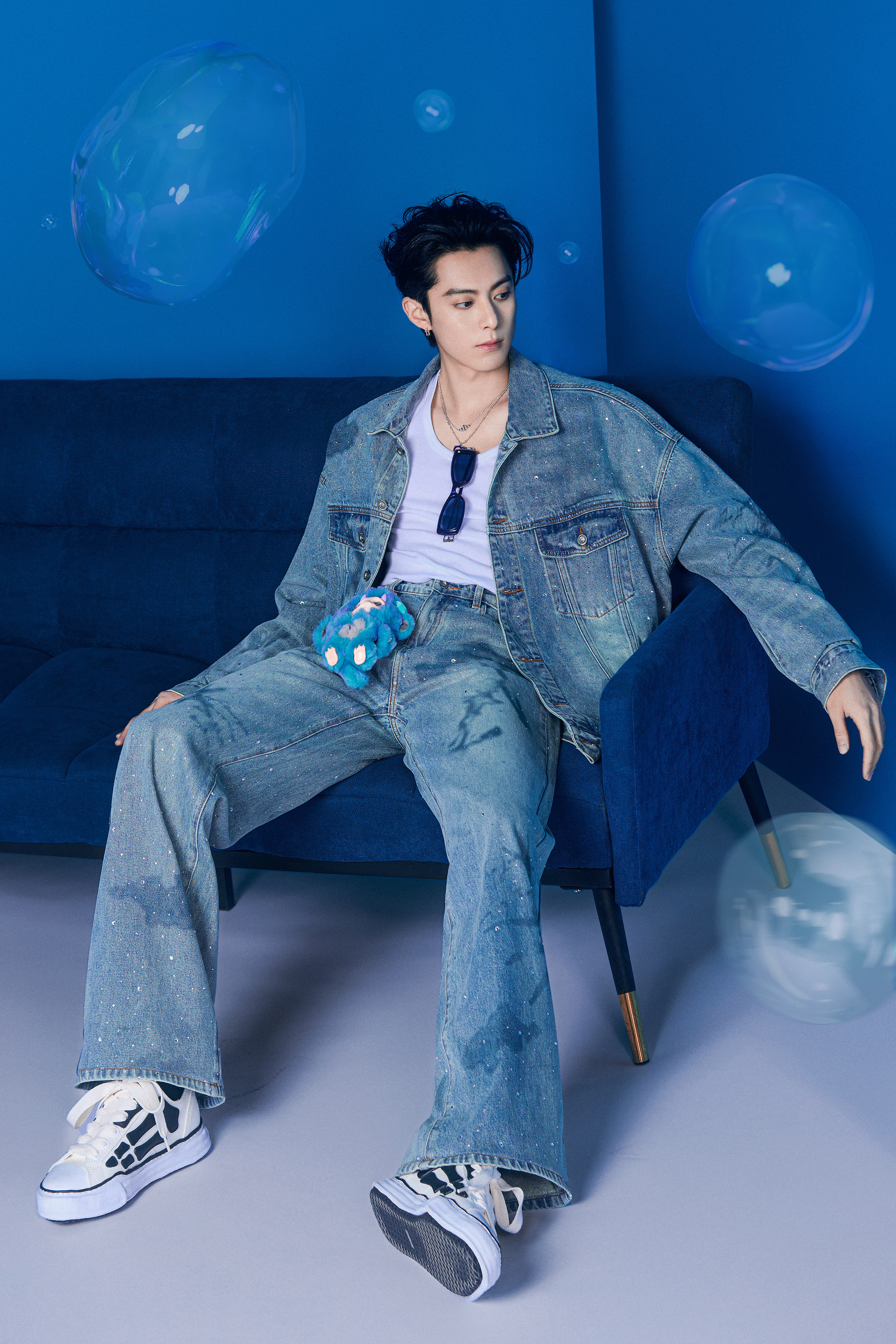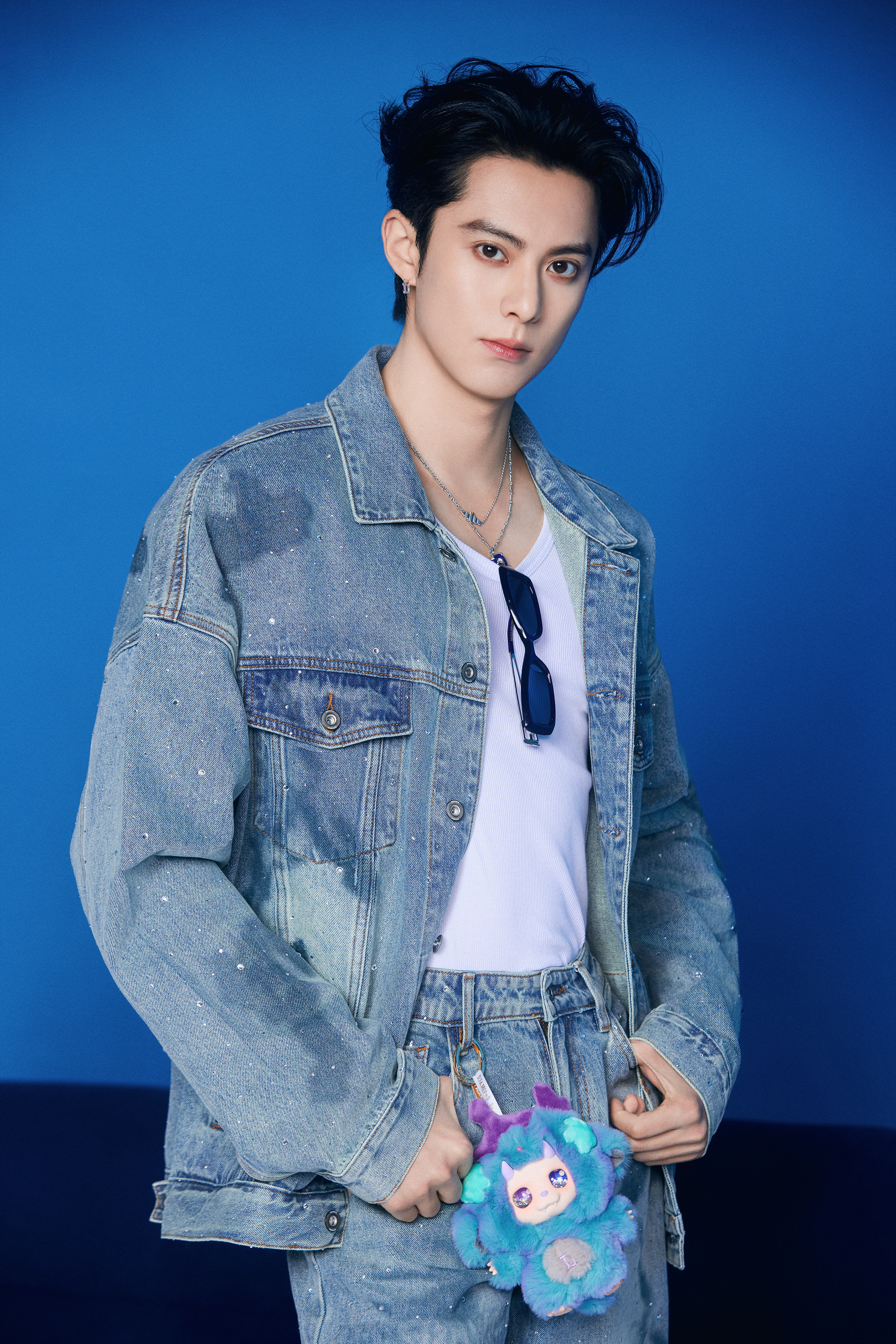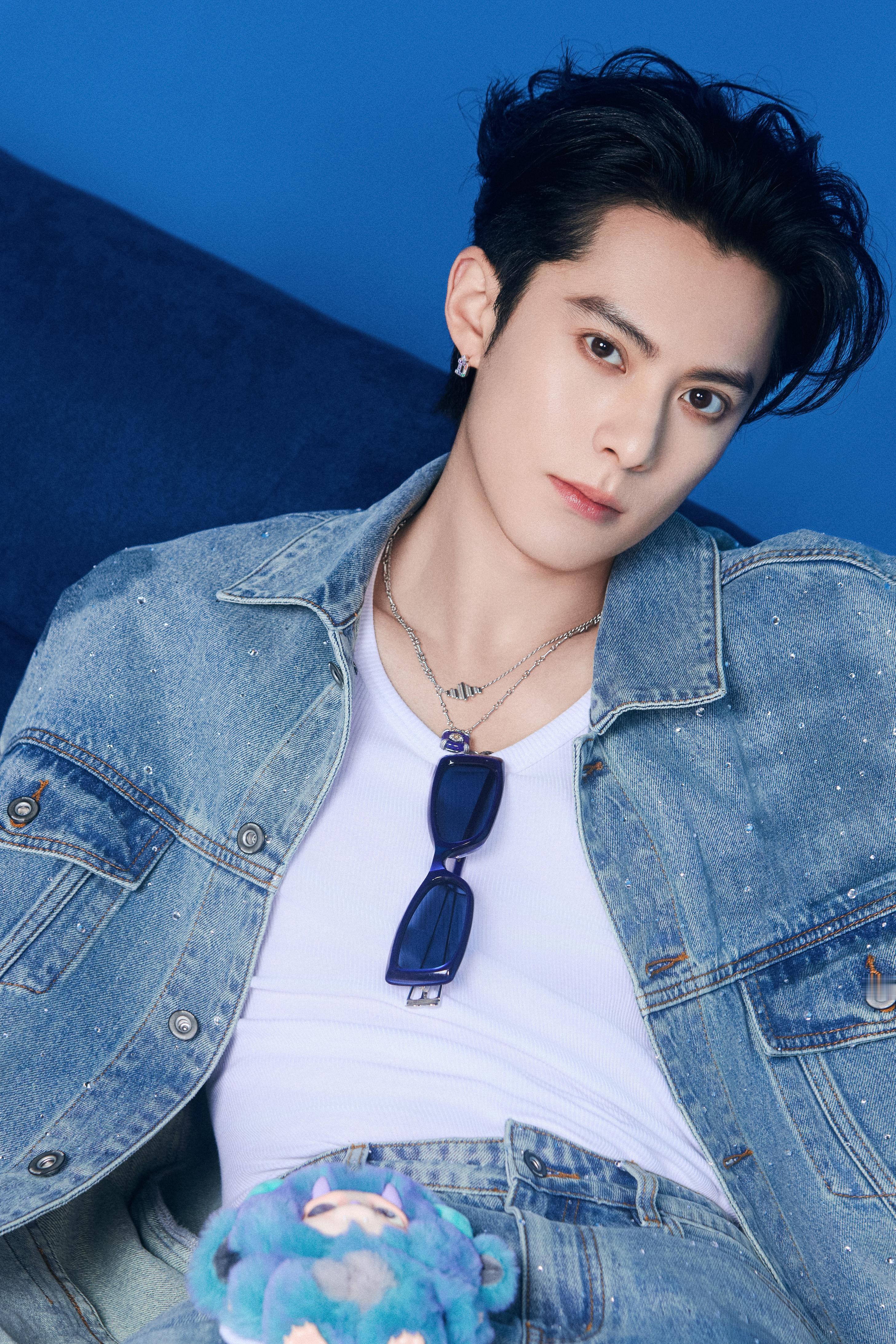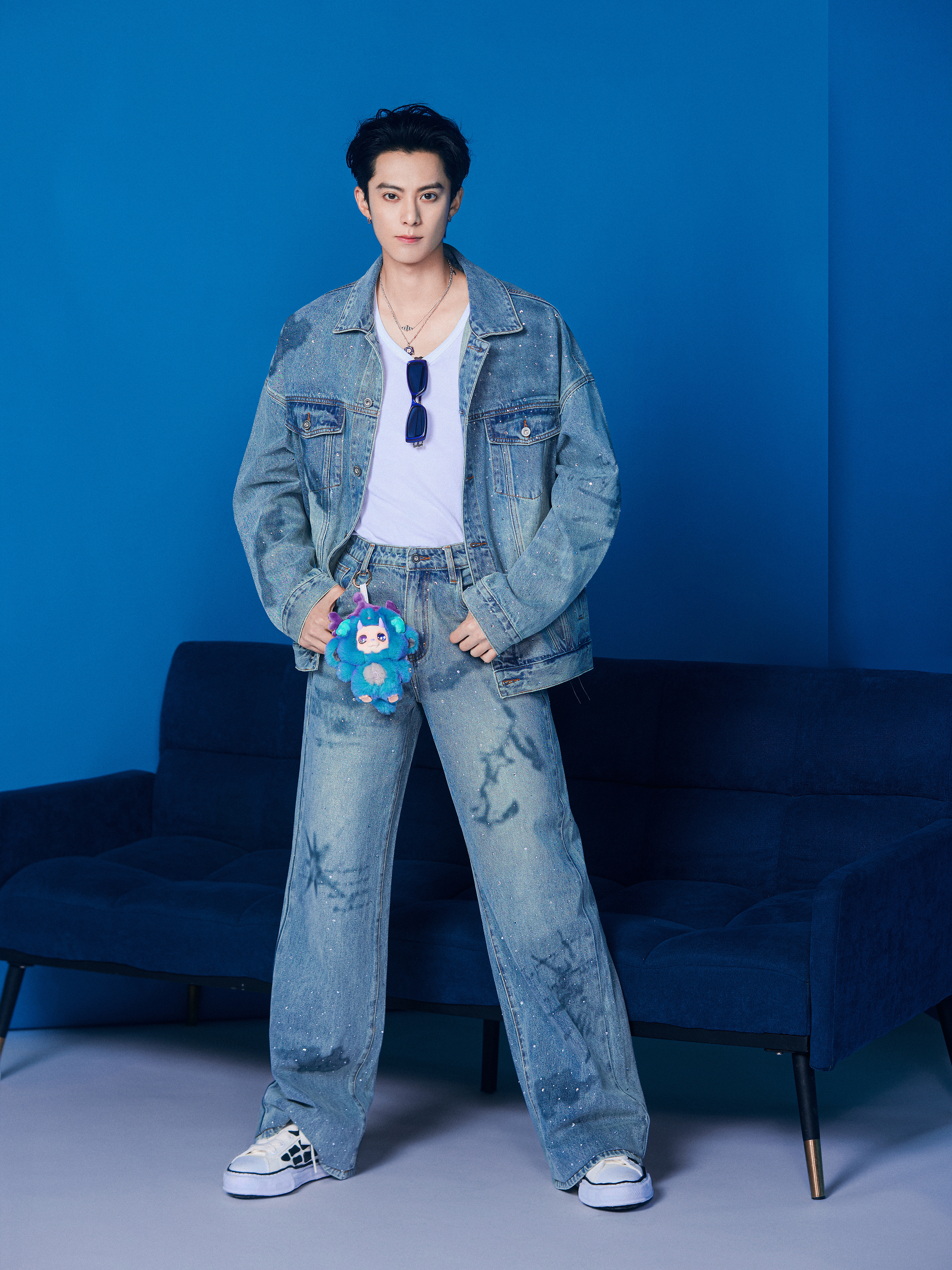 王鹤棣今日出席安慕希直播活动造型图集,身着SENSEAWEEK烫钻牛仔套装内搭白
