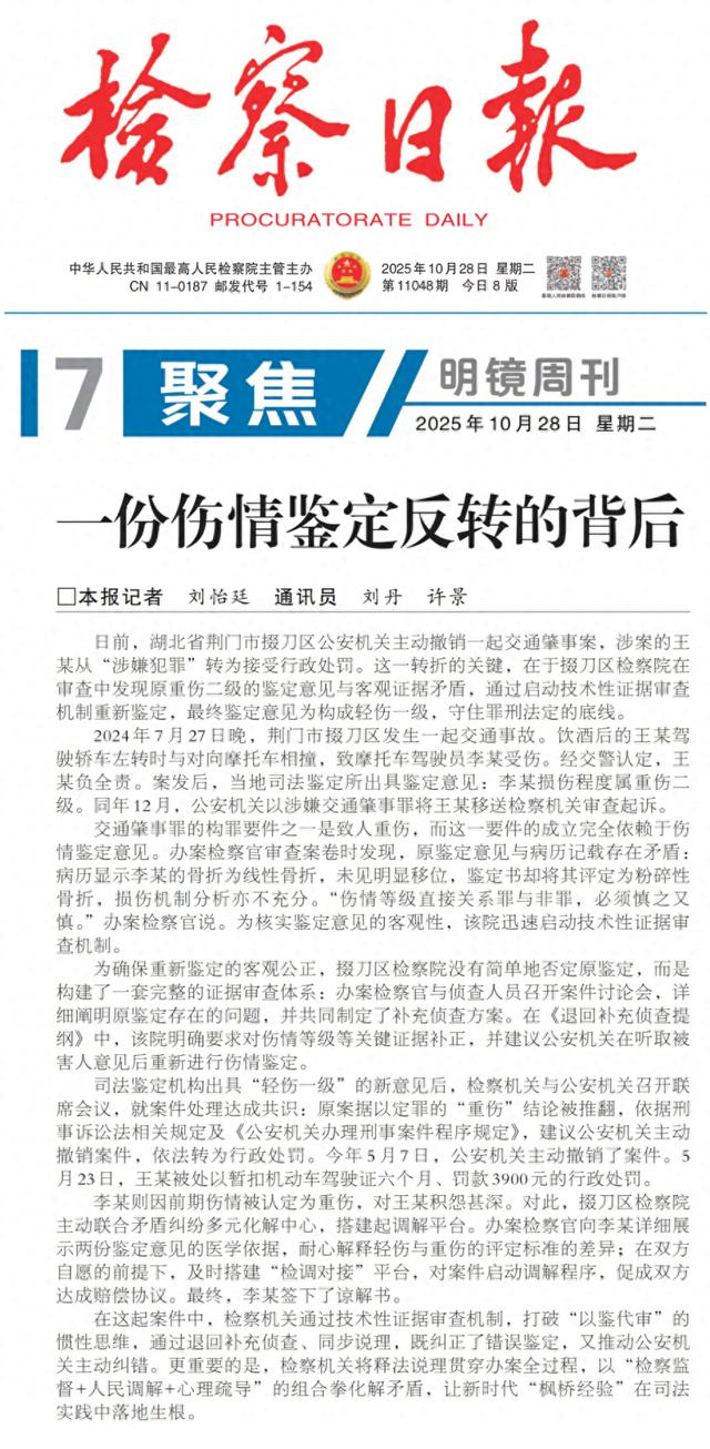 日前,湖北省荆门市掇刀区公安机关主动撤销一起交通肇事案,涉案的王某从“涉嫌犯罪”转为接受行政处罚。这一转折的关键,在于掇刀区检察院在审查中发现原重伤二级的鉴定意见与客观证据矛盾,通过启动技术性证据审查机制重新鉴定,最终鉴定意见为构成轻伤一级,守住罪刑法定的底线。