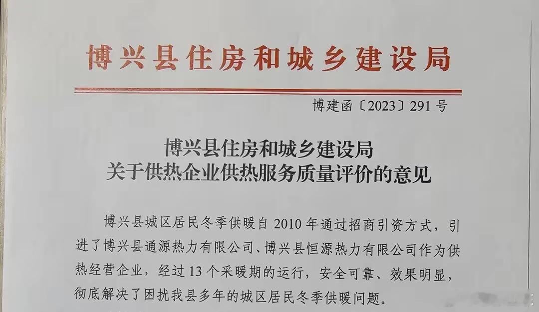 “往前追溯,2023年,博兴县住建局还专门发文对我们进行表彰,文中盛赞,‘经过13个采暖期的运行,通源、恒源热力公司安全可靠、效果明显,彻底解决了困扰我县多年的城区居民冬季供暖问题。赢得了全县城区居民的好评’。”