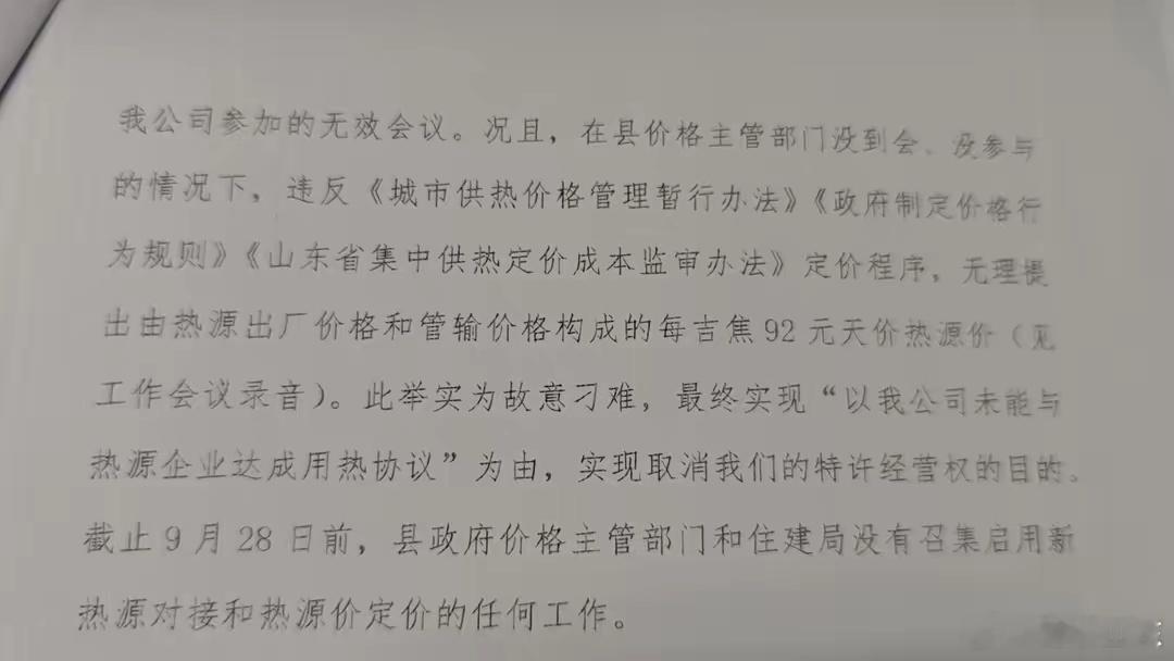 “这样的协调会仅仅是走形式,博兴县政府并未尽到《协议》中的责任与义务。”张建明律师表示,首先,新热源供应方国能博兴电厂未参会,协调会仅涉及住建局、财金集团与民企,无法就热源供应量、价格等核心问题达成共识,无法解决实质问题。第二,在县价格主管部门未参会的情况下,直接提出每吉焦92元的价格,违反《政府制定价格行为规则》的规定,“供热价格属于‘政府定价或指导价’,需由价格主管部门开展成本监审、征求公众意见后制定,住建局无定价权限,其提出的价格缺乏合法性与合理性。”