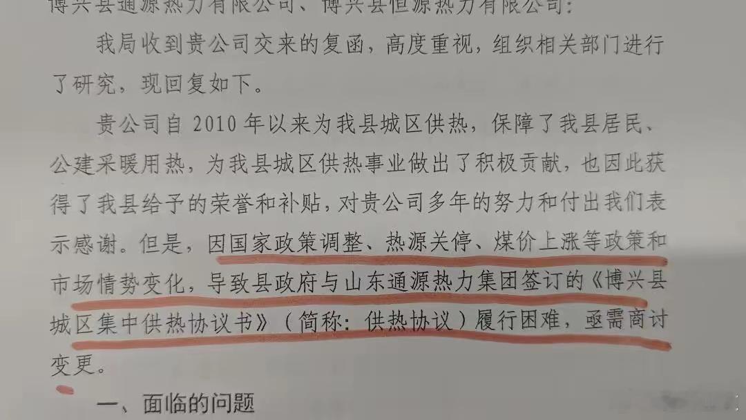 “我们公司没有自己的热源,一直是购买当地盛和电厂的热水来给居民供暖,因为国家环保政策调整,盛和电厂即将关停,需要寻找新的热源。”何绍江说,按照当初签订的《博兴县城区集中供热协议》第六条约定,作为协议一方,县政府负责协调电厂热源,为今后城市发展提供热量保证。“我们多次向政府主管部门申请协调新的热源,但一直没有得到回音。”