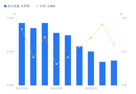 近一年(2024年9月30日至2025年9月30日),杭萧钢构A股股东户数从7.08万户,减低至6.37万户,降幅10.07%,区间股价上涨6.98%。