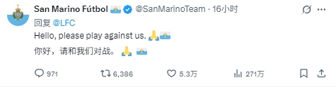 这引发了各界对利物浦的广泛批评。而FIFA目前排名倒数第一的圣马力诺也没有错过这波“天降的流量”,他们在官方社媒上发布了一张调侃利物浦和自己实力相当的梗图,又在评论区@了利物浦的官方账号,说:“你好,请和我们来踢一场。”