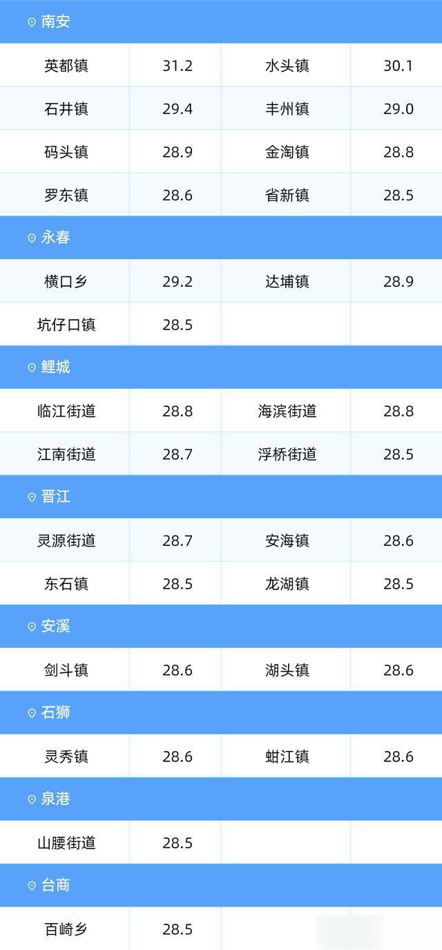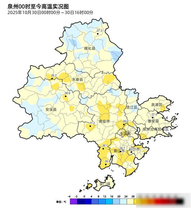 2025年10月30日00时00分~10月30日16时00分高温,有153个乡镇超过24℃,其中43个乡镇超过28℃,以南安市英都镇31.2℃为最高。