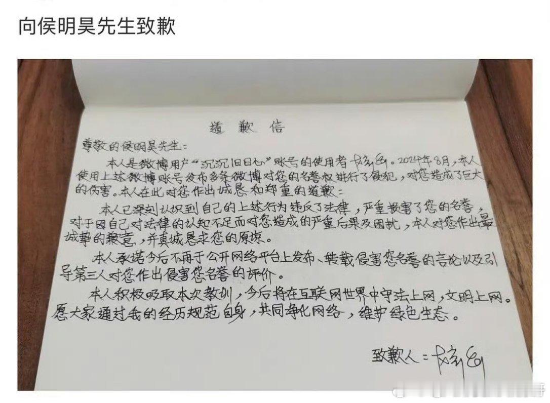 侯明昊告黑成功,黑粉手写道歉信并赔偿,支持帅哥维权[拳头]