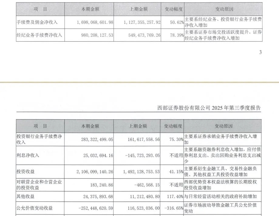 一块是经纪业务。2025年前三季度,西部证券的经纪业务手续费净收入为9.80亿元,较去年同期增加了4.31亿元,同比增长78.39%。