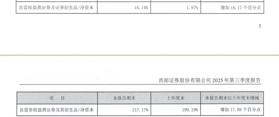 2024年9月末,西部证券的自营权益类证券及证券衍生品/净资本为8.03%,2024年12月末下降至1.97%,然后持续增加,2025年3月末为6.88%,2025年6月末为10.89%,2025年9月末为18.14%。