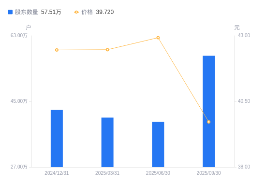 日期A股户数(户)流通A股户均持股数(股)户均持股市值(万元)2025-09-305751239589.5238.092025-06-3039456913977.6760.002025-03-3140572013592.9957.732024-12-3142637912934.3854.922024-09-3041921713228.1059.462024-06-3048106511568.3539.212024-03-3150737911003.9037.402023-12-316138399095.4624.422023-10-315732069740.4327.862023-09-305732069755.9030.22