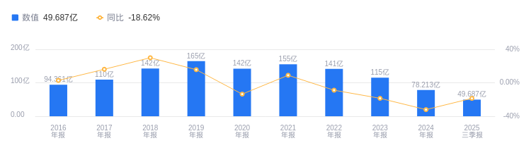 2025年三季度,美凯龙营业收入49.69亿元,行业排名5/14,高于行业平均数47.82亿元和中位数9.17亿元,但与第一名豫园股份284亿元、第二名小商品城130.61亿元差距较大。主营业务构成中,自营及租赁收入24.51亿元占比73.44%,委托经营管理收入6.09亿元占比18.26%,其他收入1.73亿元占比5.20%,建筑装饰服务收入1.04亿元占比3.10%。当期净利润-33.5亿元,行业排名14/14,远低于行业平均数8830.67万元和中位数9453.82万元,行业第一名小商品城34.65亿元,第二名富森美4.87亿元。