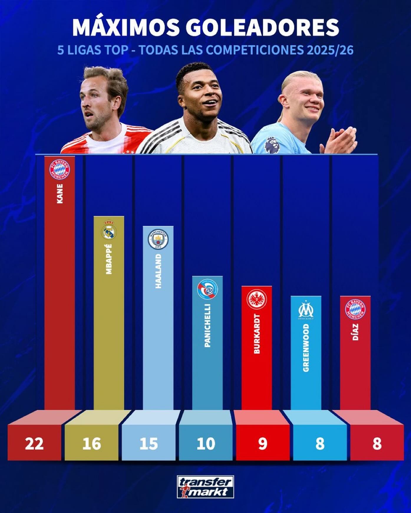 虎扑10月30日讯德国转会市场统计了本赛季五大联赛目前的射手榜,详情如下: