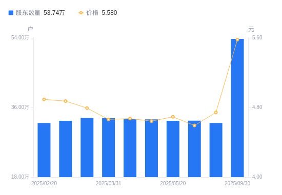 日期A股户数(户)流通A股户均持股数(股)户均持股市值(万元)2025-09-3053739424323.9113.572025-06-3031998540850.4319.382025-05-3032590040109.0118.422025-05-2032560040145.9618.842025-04-1832930039694.8918.432025-04-1033040039562.7318.492025-03-3133257339304.2318.332025-03-2033300039253.8318.812025-02-2832570040133.6419.562025-02-2032000040848.5219.99