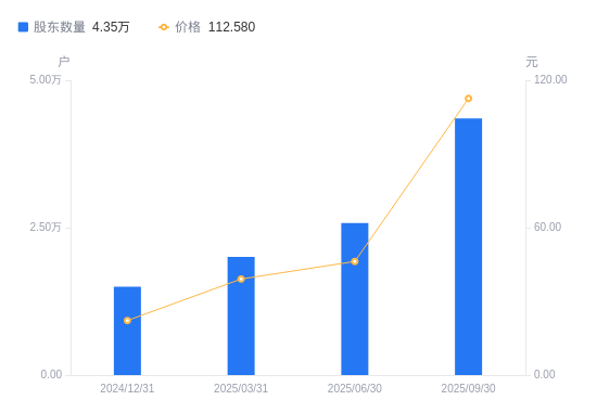 日期A股户数(户)流通A股户均持股数(股)户均持股市值(万元)2025-09-30435394682.6952.722025-06-30257917905.0636.552025-03-312005810164.5039.732024-12-311499013601.0330.192024-09-30210849431.6215.472024-06-30196164625.938.112024-03-31211523309.386.312023-12-31334232052.343.762023-09-30419431635.443.002023-08-01118985576.501.55