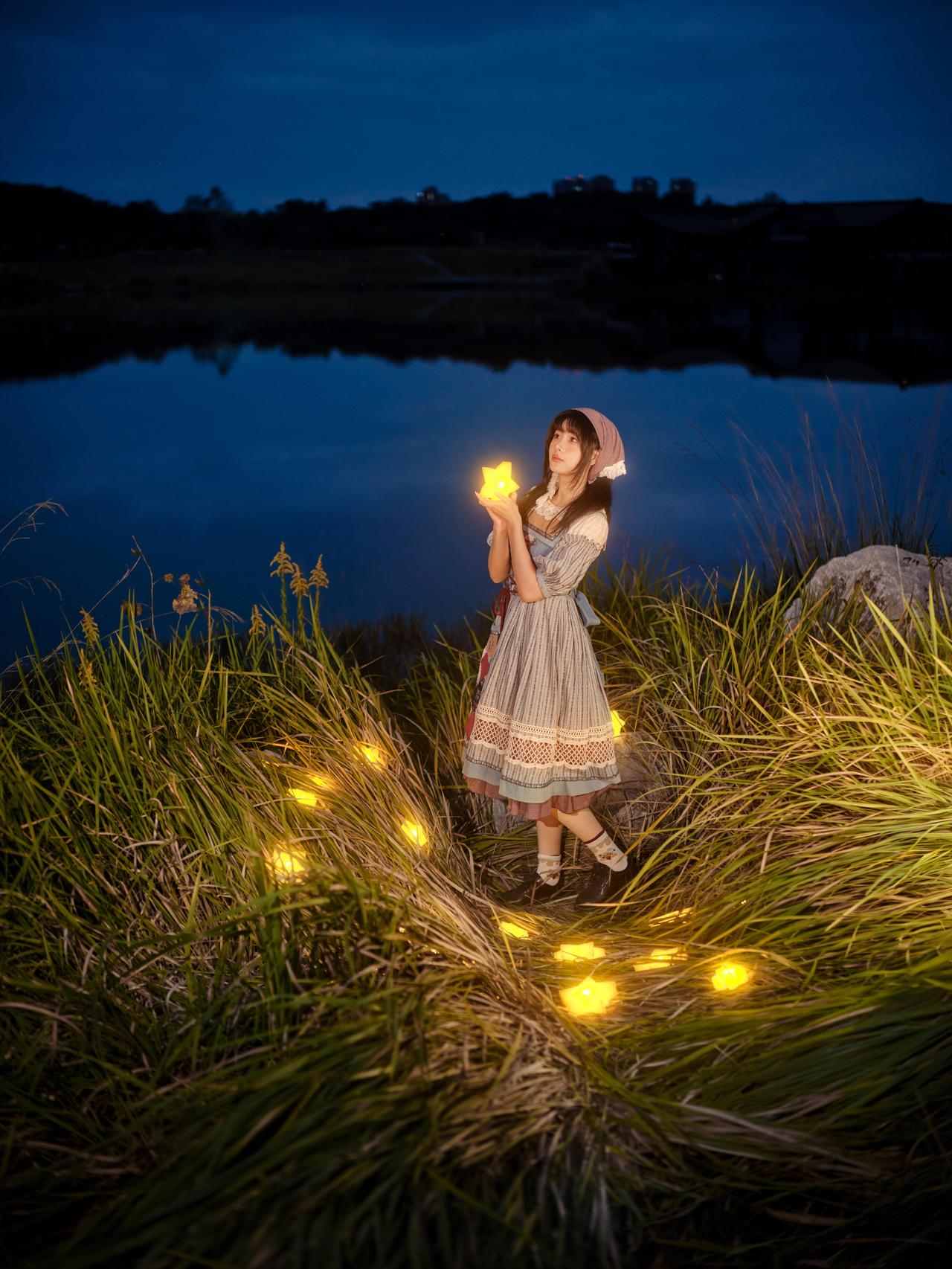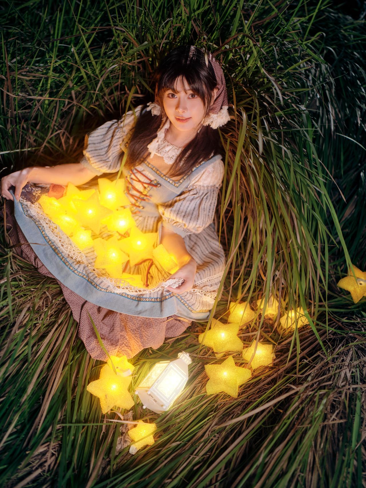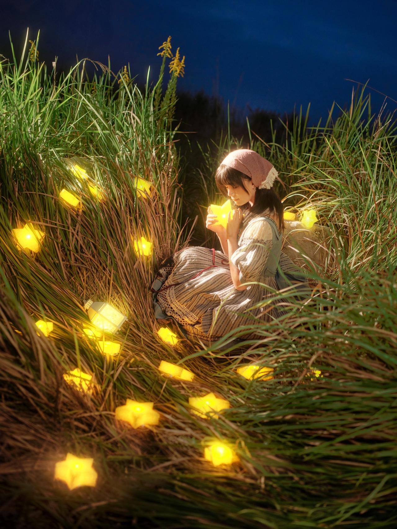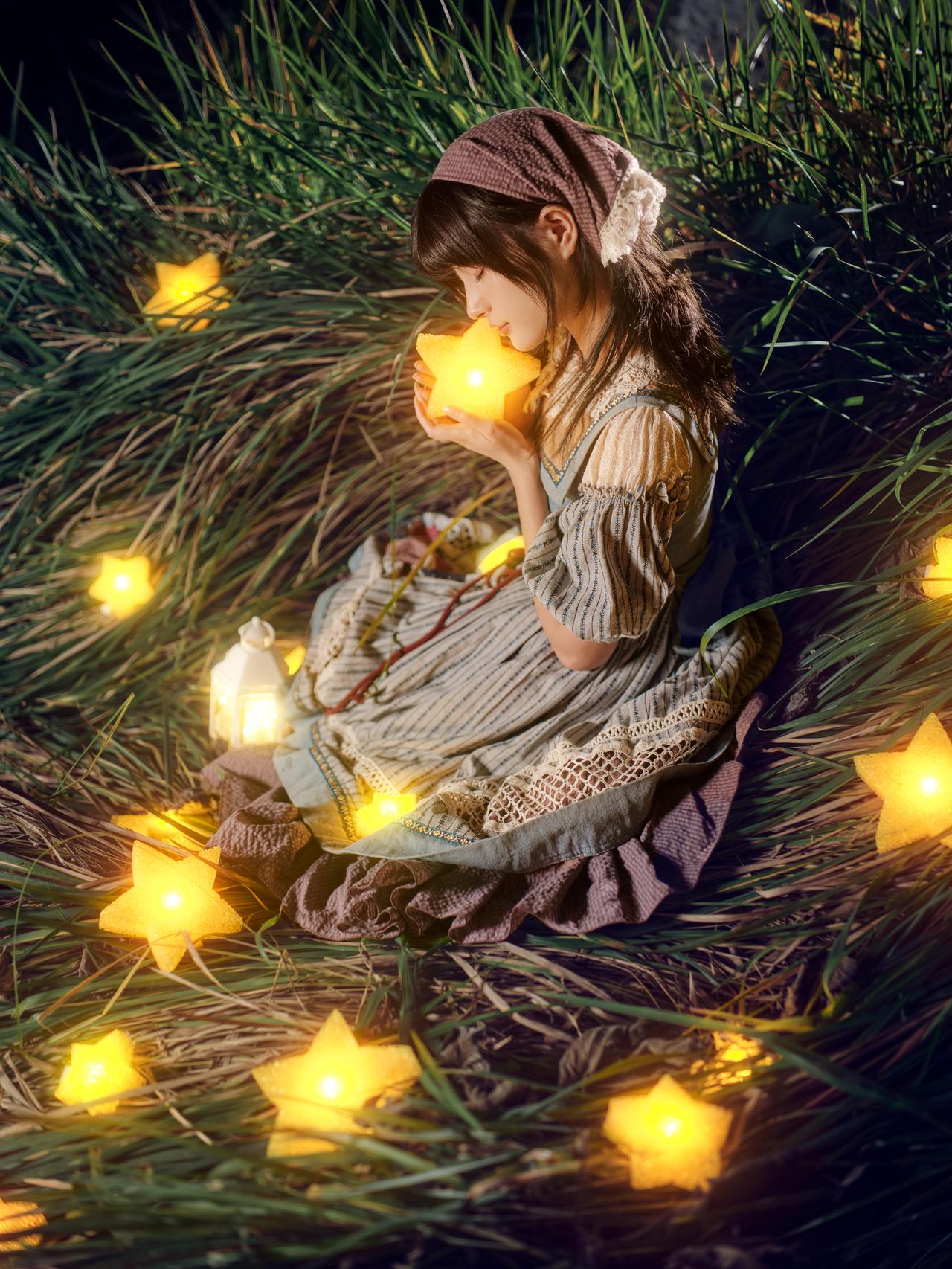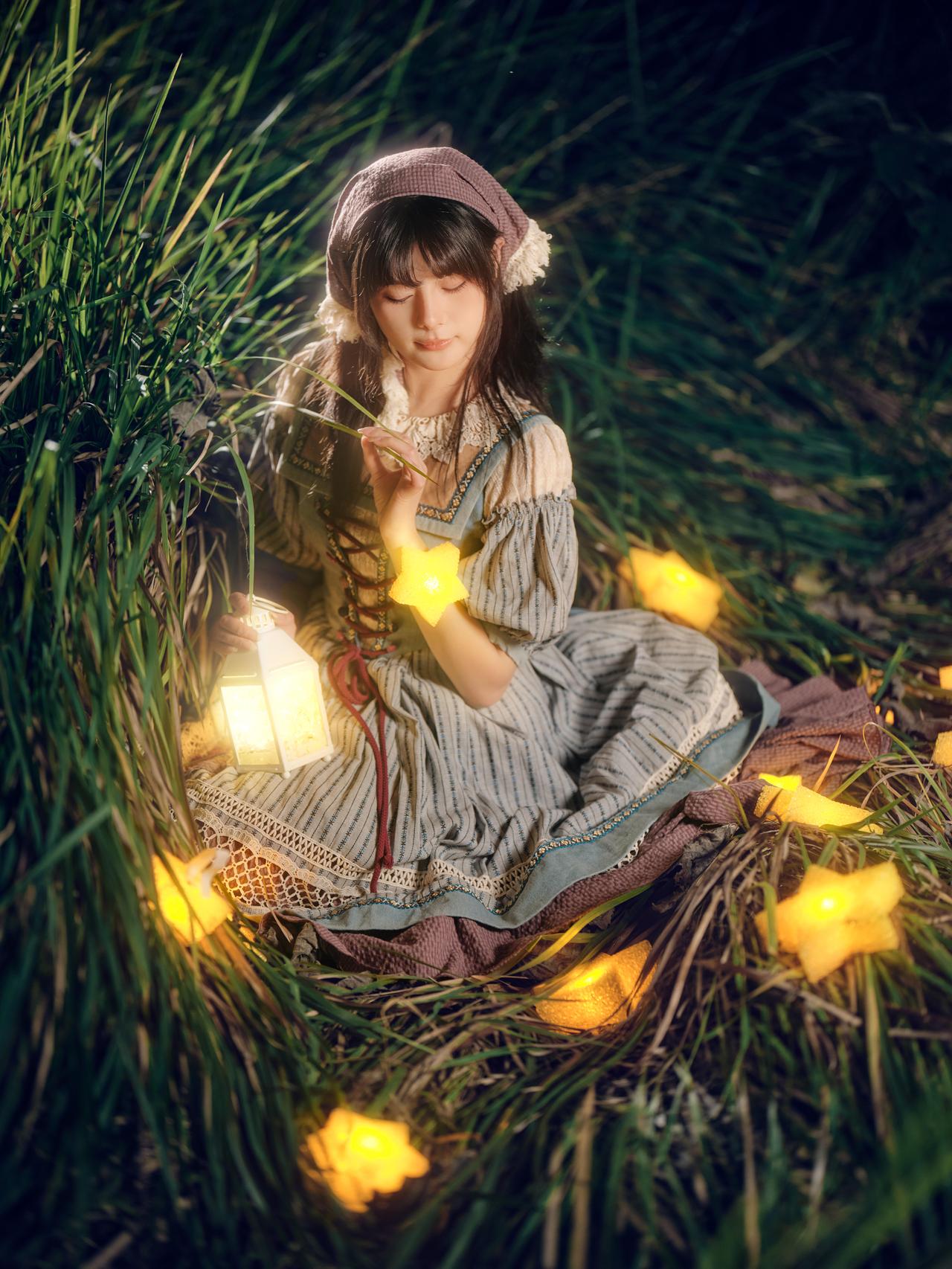 这组照片以“童话梦境”为核心创作理念,通过光影、色彩与场景的精妙结合,构建出极具沉浸感的唯美童话世界。 从光影运用来看,摄影师巧妙地将人造光源(星星灯、 lantern)与环境融合,营造出夜晚草丛中星光闪烁的奇幻氛围。暖黄色的灯光不仅是视觉焦点,更是情绪的催化剂,它驱散了夜晚的幽暗,带来温暖与希望,让整个画面充满童话般的治愈感。灯光的明暗层次处理也十分细腻,星星灯的点光源与 lantern 的面光源相互配合,形成了丰富的光影节奏,让画面既有焦点又不失层次。 色彩上,采用了低饱和的大地色系服饰搭配暖黄色灯光,与绿色草丛、深蓝色夜空形成和谐的色彩对比。服饰的复古条纹、蕾丝细节与童话主题相得益彰,既体现了角色的“童话感”,又具备了复古美学的质感。这种色彩搭配弱化了现代元素的违和感,强化了童话场景的沉浸感,让观者仿佛置身于一个真实存在的童话世界。 构图方面,摄影师运用了多种视角来丰富叙事。俯拍视角展现了人物与星星灯、草丛的整体布局,让观者感受到“草丛中的童话角落”的场景设定;平拍视角则聚焦于人物的神态与动作,传递出角色在童话世界中的情绪与互动。同时,人物与星星灯的互动构图(如怀抱星星、凝视灯光)让画面充满故事性,引导观者去想象这个童话角色的经历与内心世界。