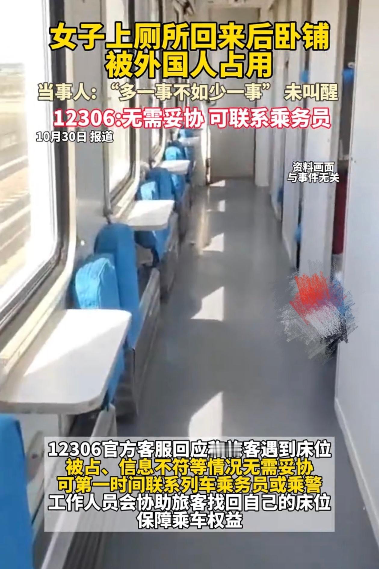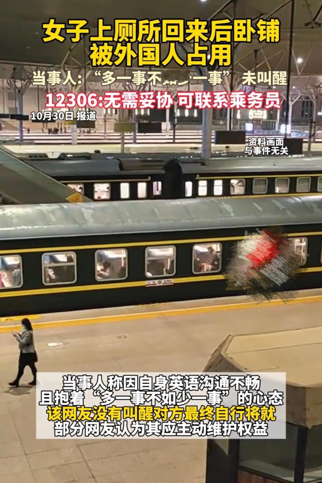 广西一女生买卧铺去上海,结果,她中途去了趟厕所,万万没想到,五分钟功夫竟让她彻底懵圈了,自己的床铺上躺着个陌生男人,盖的还是她的被子! 女生站在过道里进退两难,铺位上那人睡得雷打不动,鼾声此起彼伏,她瞅了瞅对方的肤色和轮廓,心里咯噔一下,这咋办,自己那点半吊子英语连点餐都费劲,更别说跟人理论了。 车厢里灯光昏暗,空调呼呼作响,女生抱着行李站了快十分钟,腿都站麻了,旁边铺位的大姐探出头说"去找乘务员啊",她摆摆手示意算了,看了眼手机显示还有四十多分钟到站,反正自己也不困了,何必为这事儿闹得鸡飞狗跳。 她掏出手机对着铺位拍了段视频发到社交平台,配文只有四个字"哑巴吃黄连",没想到评论区瞬间炸了锅,有人直言"今天占铺明天指不定占啥",还有人急得直跺脚"姑娘你这是助长歪风啊",更多人在教她如何维权,从找列车长到报警,从翻译软件到肢体语言,办法一条接一条。 女生看着评论区越来越激动的网友,心里五味杂陈,其实她不是怕麻烦,就是觉得人生地不熟的,对方又听不懂中文,万一闹僵了自己吃亏,谁知道评论里那么多人说她这是"惯坏了不守规矩的人",她这才意识到问题的严重性,赶紧去找了乘警。 乘警一听情况二话不说就跟着去了,到铺位前也不管对方听不听得懂,直接用中文加手势让人起来,那男的迷迷糊糊睁开眼,看见警察立马坐了起来,乘警调出购票信息一核对,发现对方的铺位在另一节车厢,原来是走错了地方,人家还以为自己睡对了呢。 事情解决了,女生坐回自己的铺位,心里却堵得慌,她把被子重新铺好,想着要不是网友提醒,自己就这么忍下来了,突然觉得挺憋屈的,几百块钱的卧铺票不是大风刮来的,凭啥让给别人睡。 12306客服后来也回应了这类事件,说得特别明白,卧铺是实名制的,谁的票谁使用,遇到占座别管对方是哪国人,直接找乘务人员,就算语言不通也有办法解决,乘客的权益必须得到保障,这是铁路部门的责任。 网友的评论一针见血:"你的退让在别人眼里就是软柿子,捏一次就想捏第二次",还有人说"老外在自己国家也得守规矩,凭啥到咱这儿就能例外",这些话虽然直白,但确实戳中了问题的要害。 说到底这事儿反映的是个普遍心态,很多人遇事第一反应就是"算了吧",觉得维权太费劲,不如自己吃点亏图个清净,可这种想法恰恰给了某些人钻空子的机会,你今天让一步,明天他就敢进两步,最后吃亏的还是守规矩的人。 古人讲"有理走遍天下",这话放在现在依然管用,遇到不公平的事儿,该发声就发声,该维权就维权,不是让大家咄咄逼人,而是要懂得保护自己的合法权益,退让不是美德,守住底线才是智慧。 这或许就是"善良要有锋芒"的道理吧,温柔不等于软弱,礼貌不代表可以被欺负,下次再遇到类似的事儿,记得第一时间找工作人员,别让自己花钱买的权益白白送人。