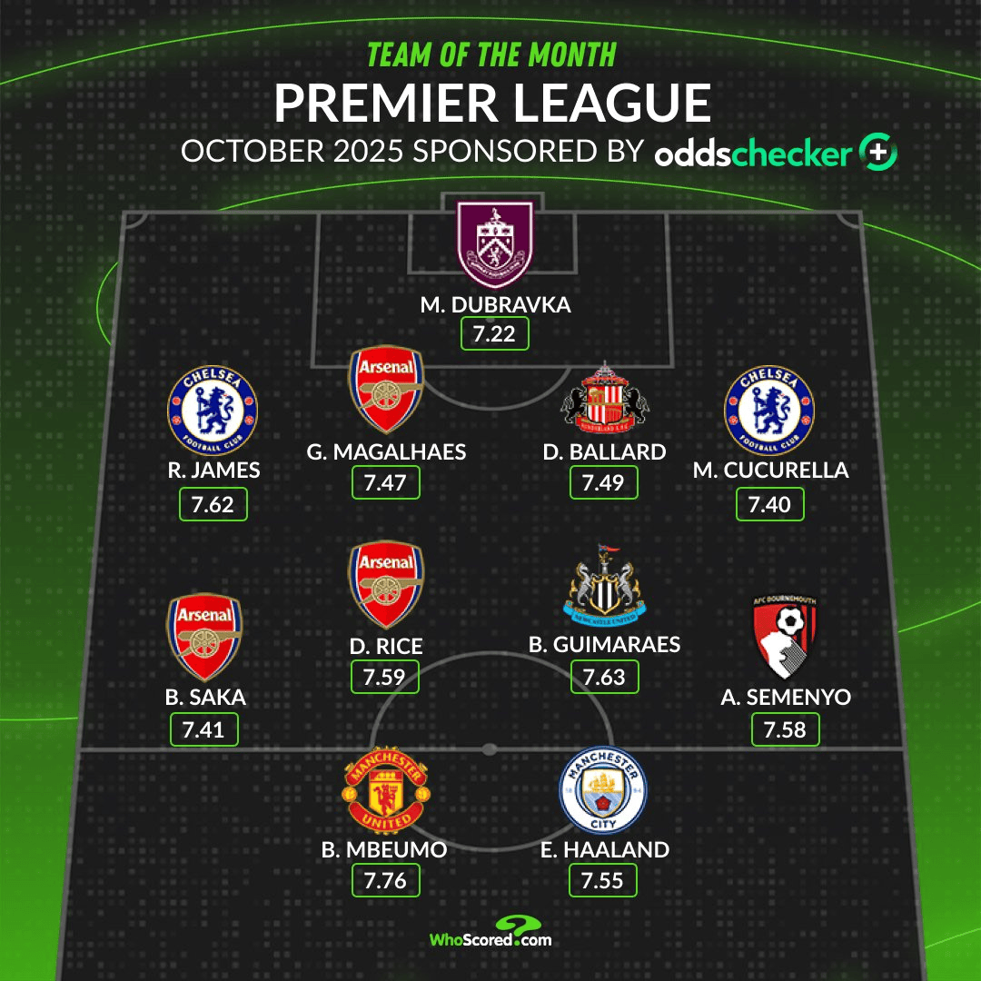 虎扑10月31日讯whoscored根据网站统计的评分发布了英超十月的最佳阵容。