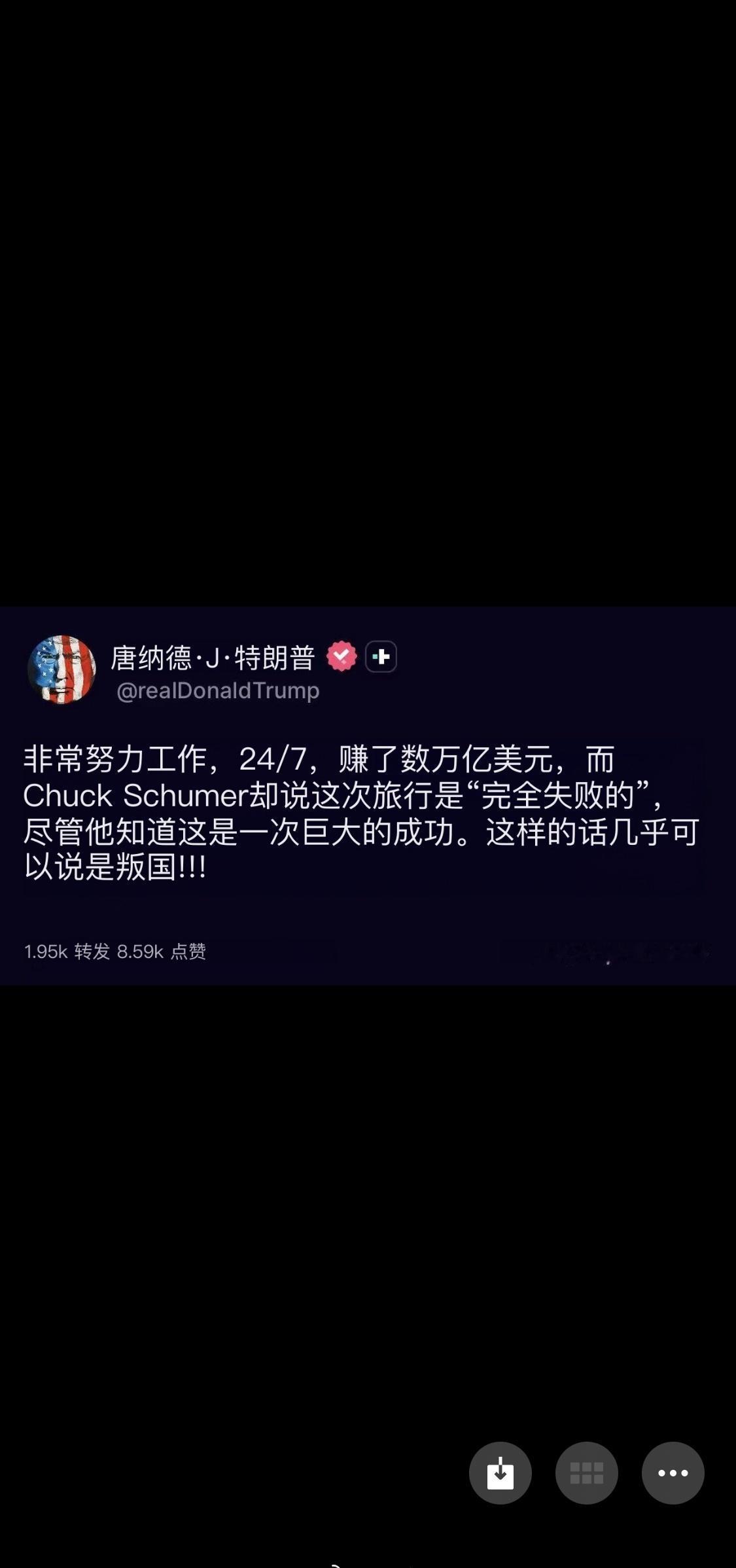 川普:我7X24小时勤奋工作,(给美国)赚了万亿美元,(民主党)舒莫竟然说我这趟访问活动完全失败,这种言论真的算叛国罪!