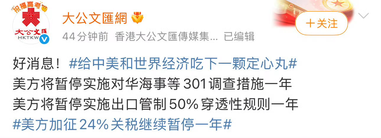 美方加征24%关税继续暂停一年