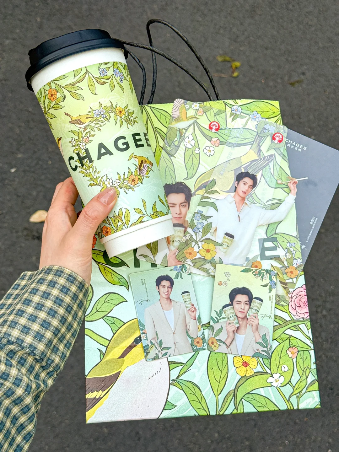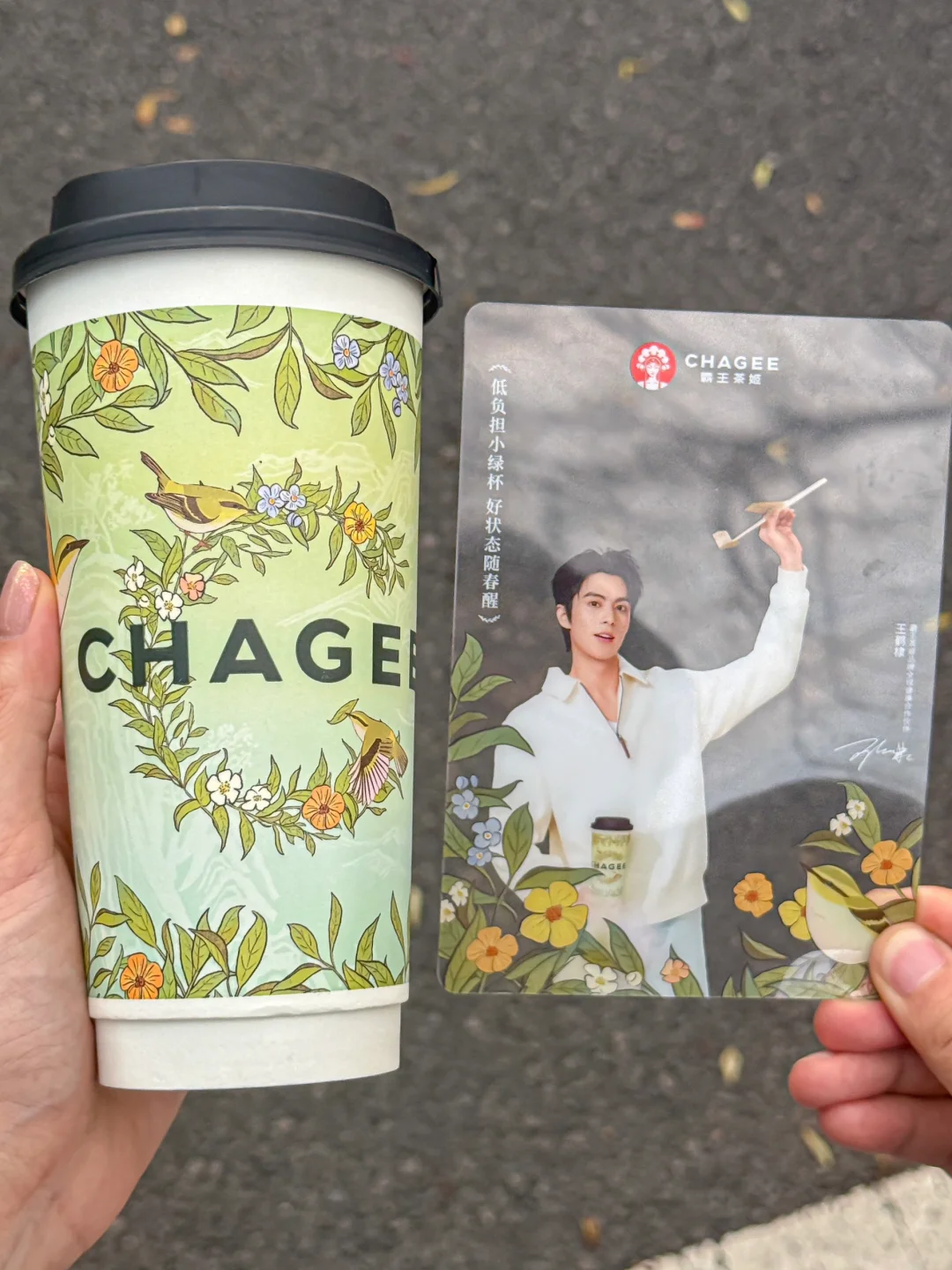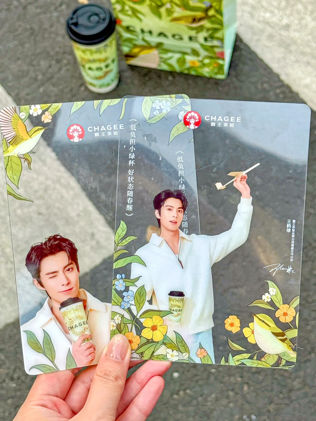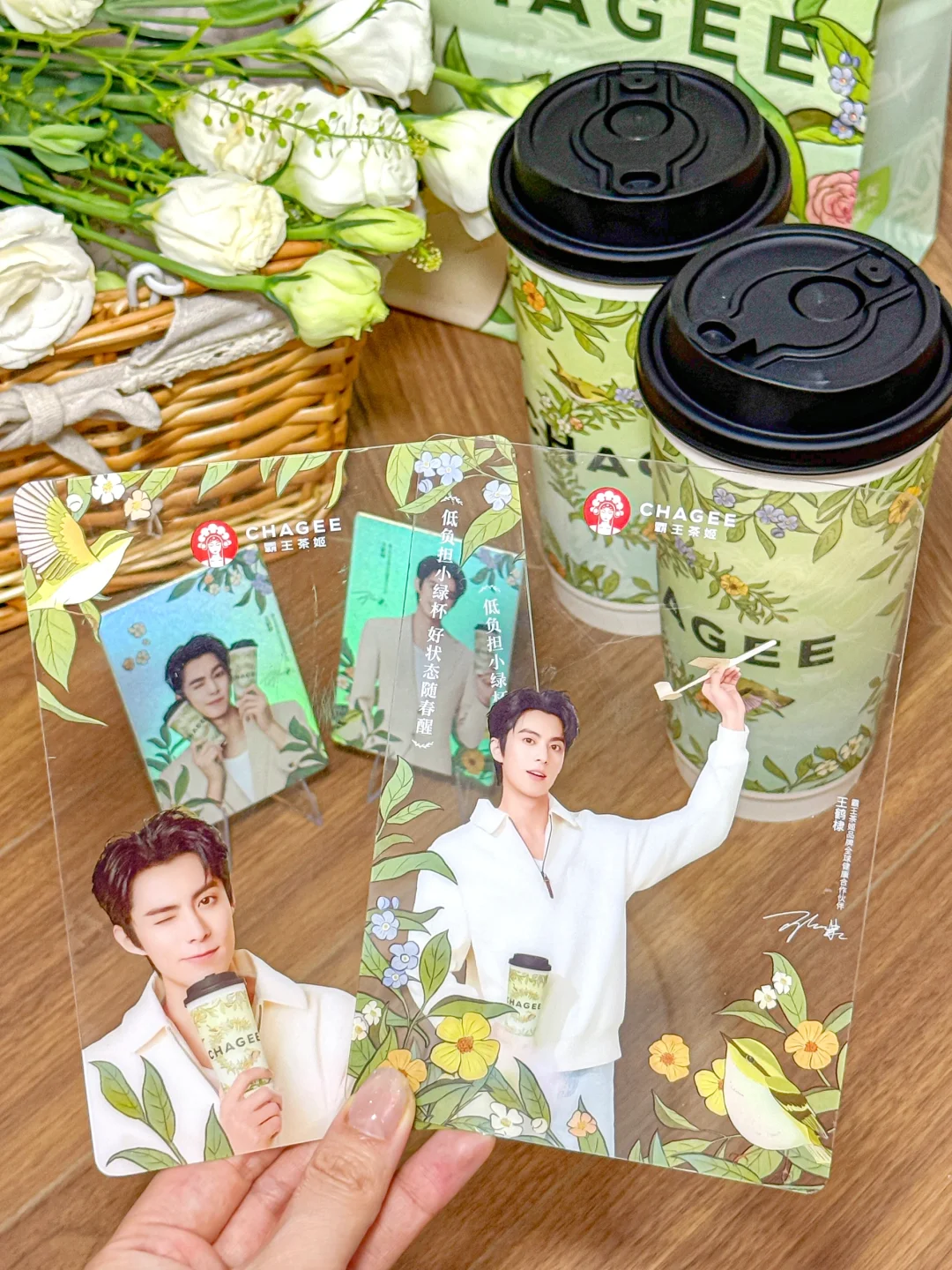 含棣量超标。。追星女孩狠狠心动了!!! 买霸王茶姬醒时春山套餐就可以get王鹤棣周边!! 有小卡、透卡、立牌、折页贴纸! 质感是真的好啊啊!!全套All in的幸福谁懂!! 醒时春山也吼吼喝!!龙井香好清新~ 每一口都是春天的味道!