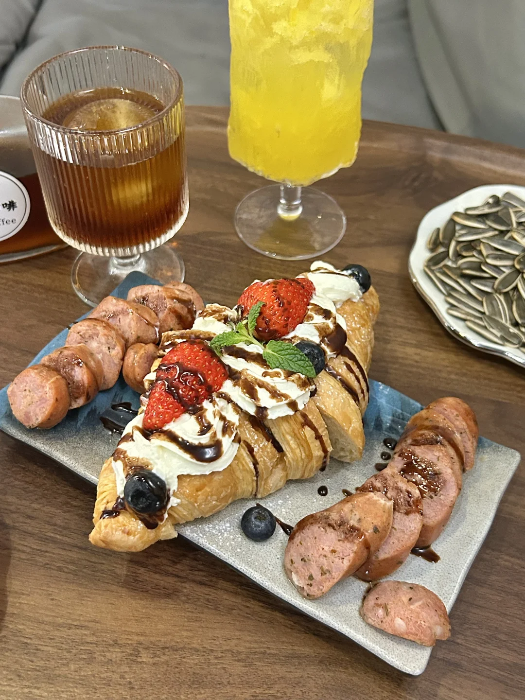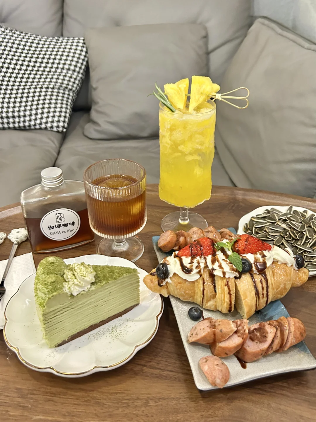 藏在御龙湾的漂亮店!! 真的很舒服惬意!适合小姐妹聚会唠嗑💬 打开拍照也okk!氛围感很足✨ 餐品颜值也很高!! 据说晚上会化身为小酒馆哦~🍸 ☕️冷萃:夏天来一杯真的好过瘾 意外的不错🤤喝起来苦味很少 搭配冰球🧊入口口感很顺滑干净 🥐牛角包小香肠:很酥脆 上面裹满了奶油 搭配草莓蓝莓 酸酸甜甜很过瘾 香肠很Q有嚼劲 🍰抹茶千层:味道浓郁绵密 口感丝滑🍵茶味十足 太上头了!! ☕️B² GAYA COFFEE HOUSE· 伽倻咖啡
