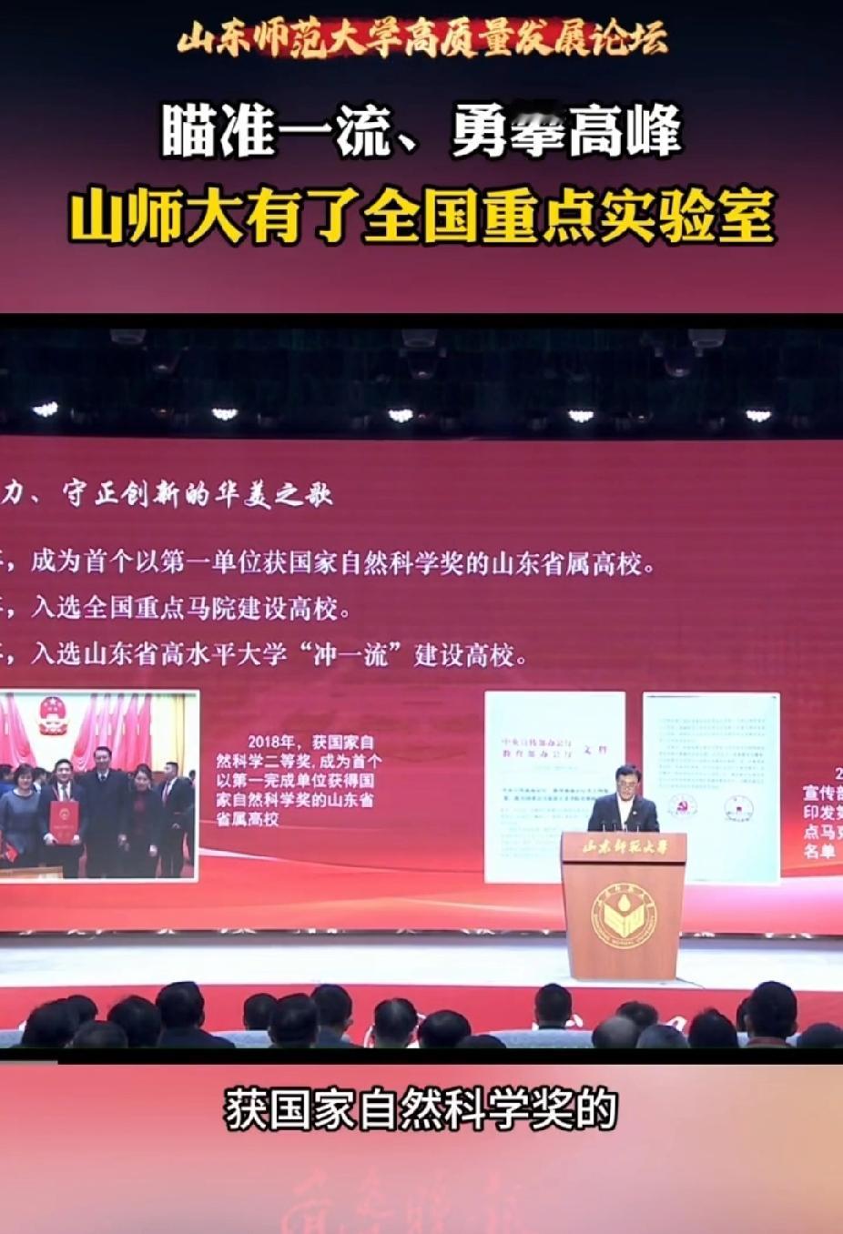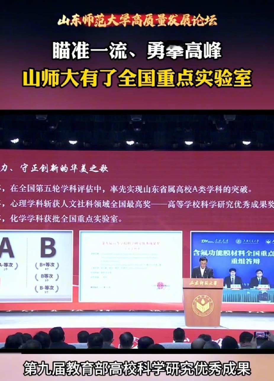 山东师范大学终于有了全国重点实验室,可惜晚了两年,冲击双一流还得加把劲。 成为双一流高校是有门槛的,根据网上的消息,门槛可能是以下三个条件: 1、有a类学科。 2、有国家重点实验室。 3、拿到有影响力的国家级大奖。 当时山东师范大学已经有了a类学科,是首个拿到a类学科的山东省属高校。2018年拿到国家自然科学二等奖,份量也够了,但偏偏卡在了国家重点实验室这一关。当时山东师范大学没有国家重点实验室。 当时山东方面也不怎么重视山师,结果就是急来抱佛脚。当时山东师范大学联合齐鲁制药、山东省肿瘤防治研究院申请省部共建化学成像材料于技术国家重点实验室,用来紧急弥补山东师范大学没有国家重点实验室的缺陷,力求山东能出现一个双一流的省属高校。 策略是对的,只可惜运气不好。那时候碰到了国家改革实验室体系,当时的国家重点实验室都要重组成全国重点实验室。这也影响到了新申请的实验室,必须修改标准。 根据山师校长的演讲,山东师范大学全国重点实验室应该是2024年批下来的。 但是吧,双一流高校建设以五年一个建设周期,山师的国家自然科学二等奖是2018年拿到的,到现在已经七年了,很可能无法参与这一轮双一流建设。 看来山师还得拿一个有影响力的大奖才行。