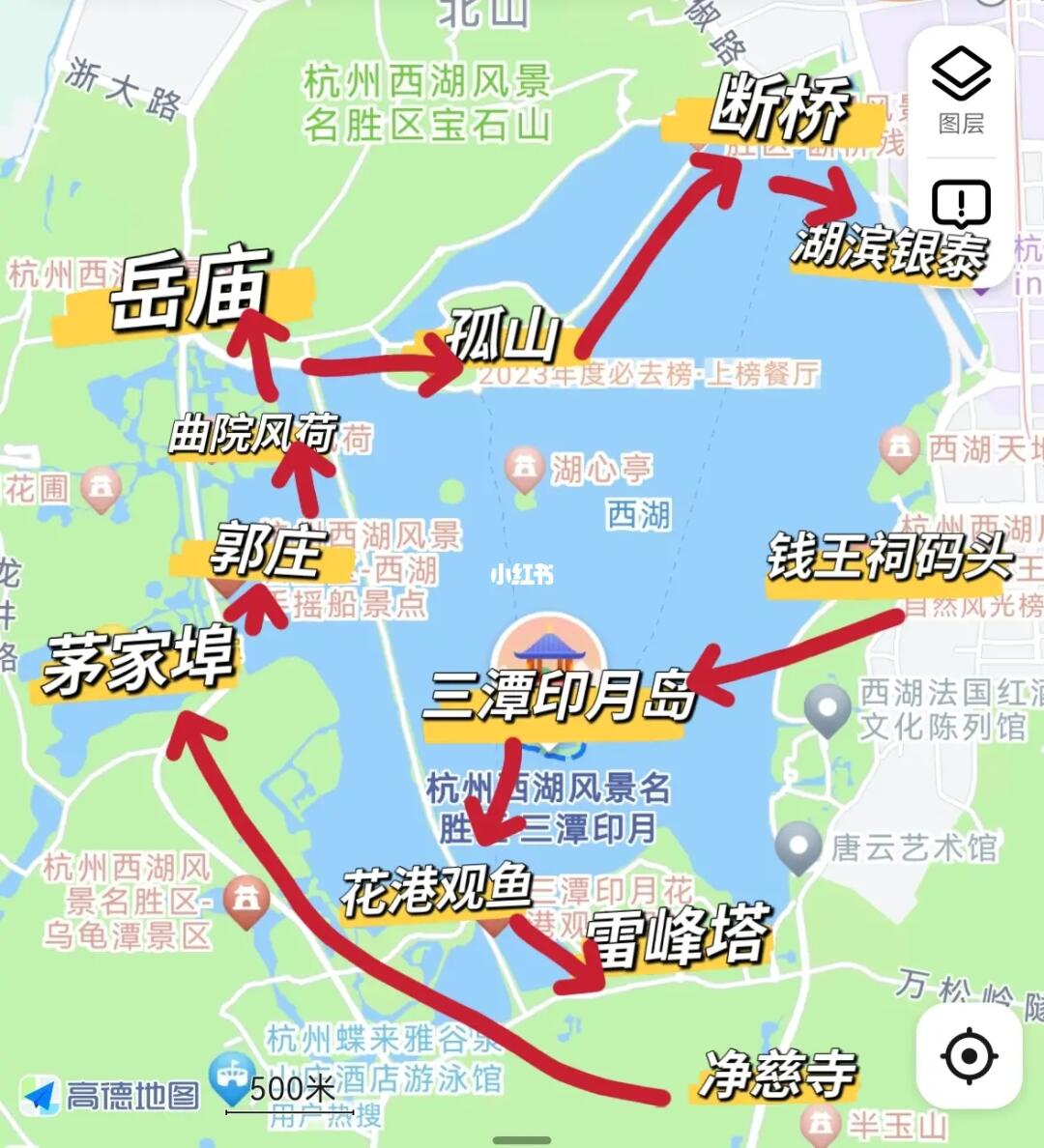 地铁7号线吴山广场C口出-钱王祠码头-三潭印月岛-花港观鱼-雷峰塔-净慈寺-郭庄-曲院风荷-岳庙-孤山-断桥-湖滨夜市