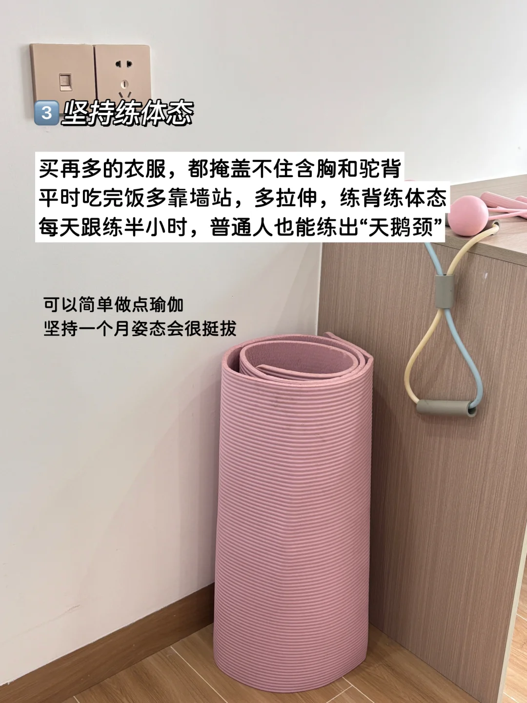 平时吃完饭多靠墙站,多拉伸,练背练体态