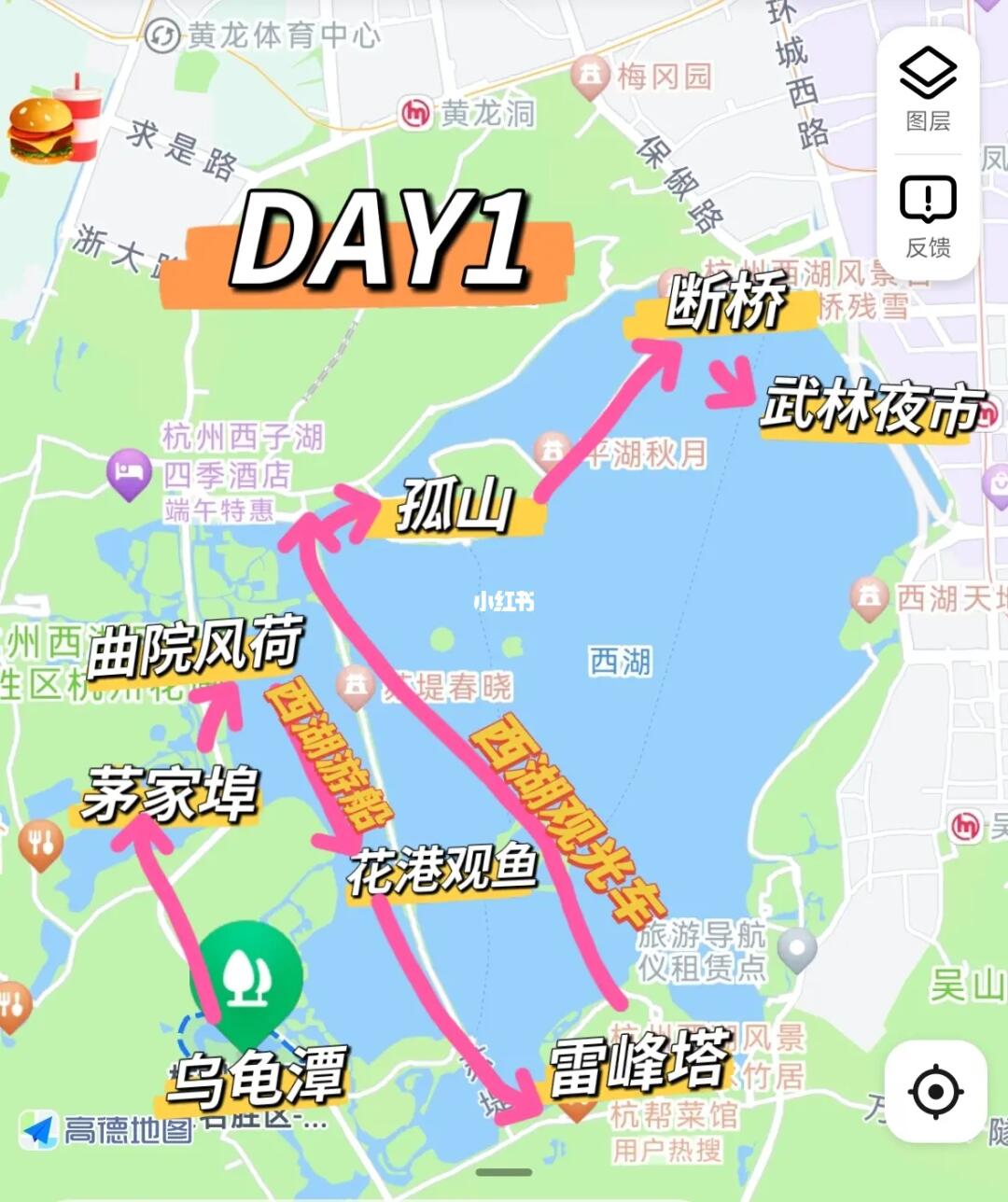 乌龟谭-茅家埠-曲院风荷赏荷花-坐西湖游船到花港观鱼-雷峰塔-10r观光车-岳庙-孤山看日落-白堤断桥-武林夜市