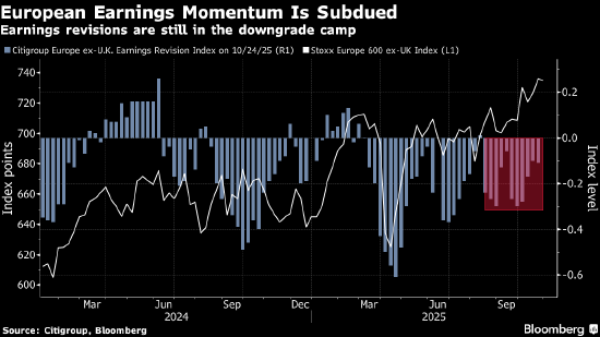 随着经济数据保持强劲且财报季迄今带来积极惊喜,欧洲股市徘徊在本周创下的历史高位附近。根据截至周三的数据,迄今已公布业绩的公司第三季度每股收益上升5%,好于分析师预计的0.4%降幅。