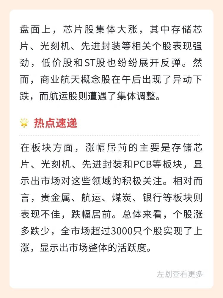 👉 盘面上,芯片股集体大涨,其中存储芯片、光刻机、先进封装等相关个股表现强劲,低价股和ST股也纷纷展开反弹。然而,商业航天概念股在午后出现了异动下跌,而航运股则遭遇了集体调整。
