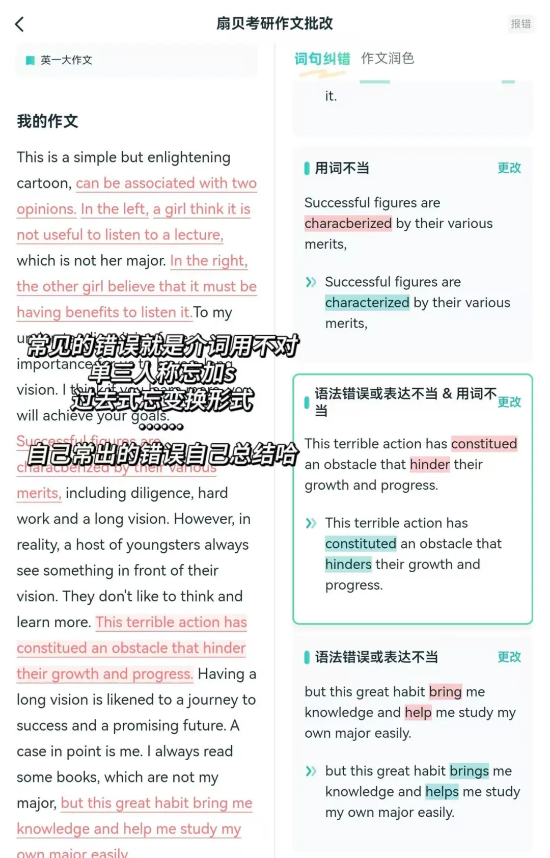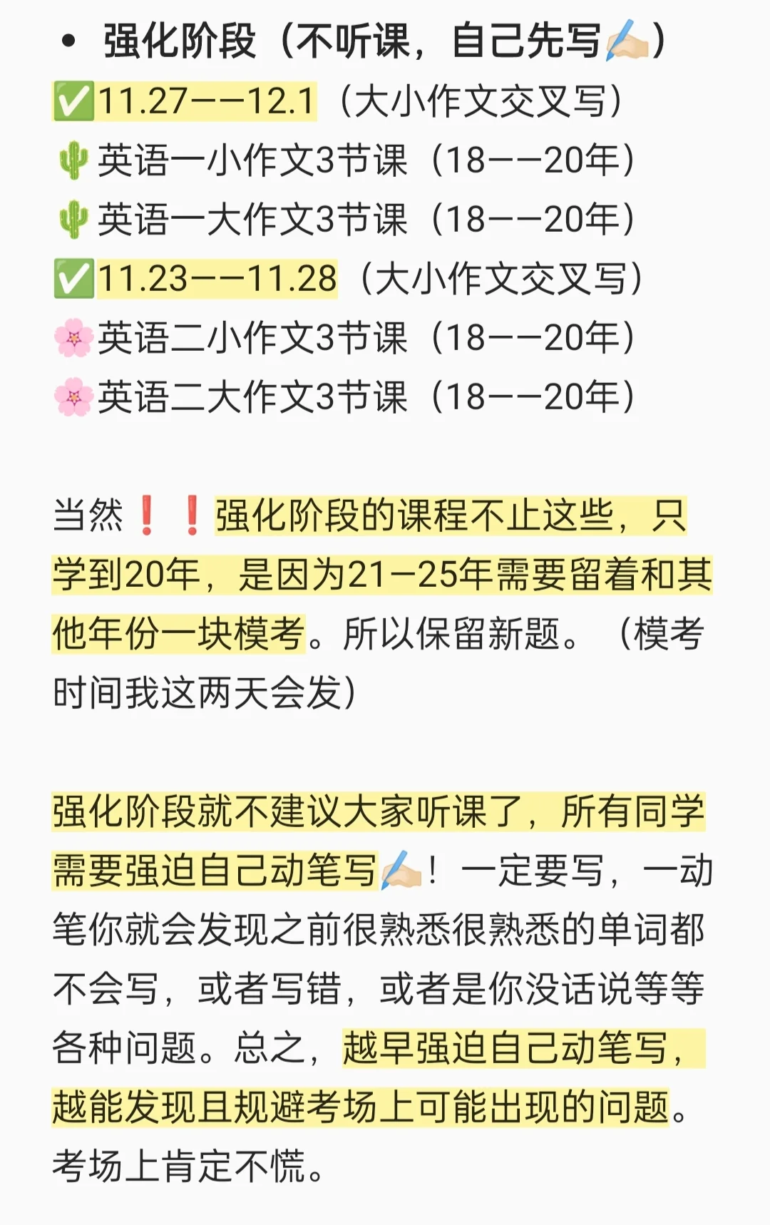 强化阶段就不建议大家听课了,所有同学需要强迫自己动笔写✍🏻!一动笔你就会发现之前很熟悉很熟悉的单词都不会写,或者写错,或者是你没话说等等各种问题。总之,越早强迫自己动笔写,越能发现且规避考场上可能出现的问题。