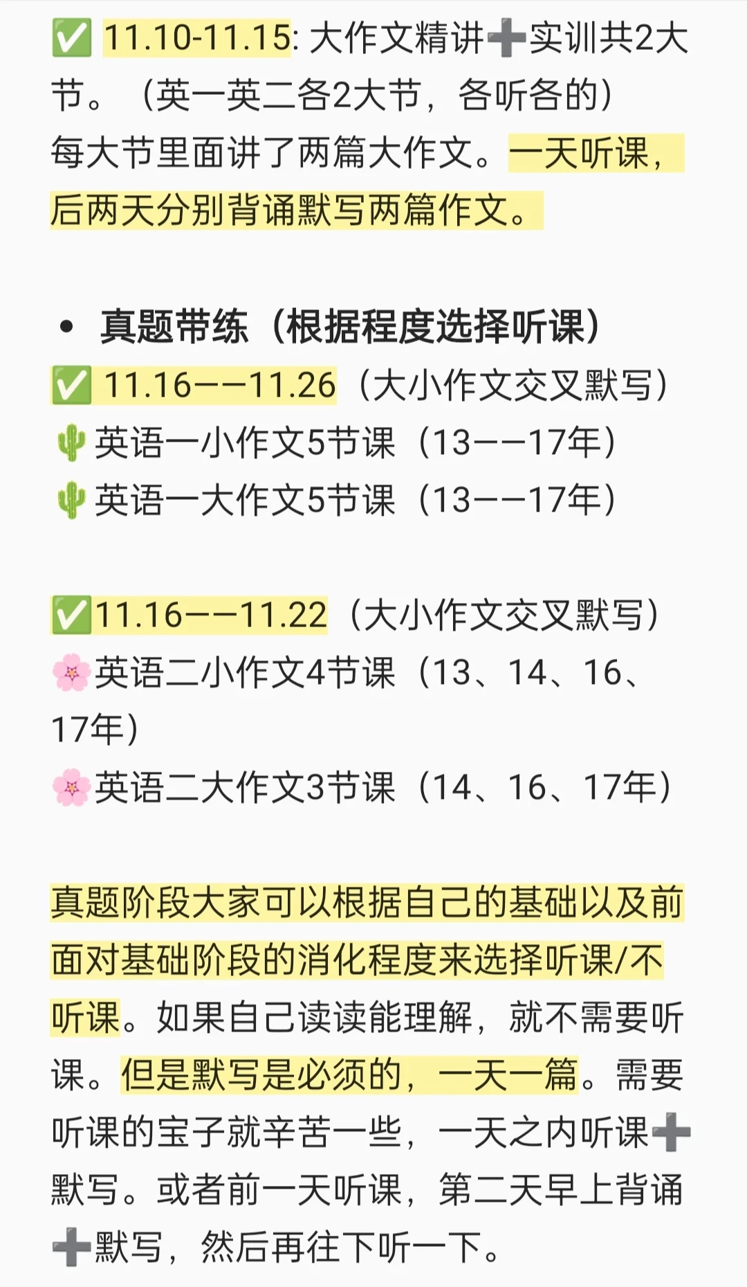 ✅ 11.10-11.15: 大作文精讲➕实训共2大节。(英一英二各2大节,各听各的)