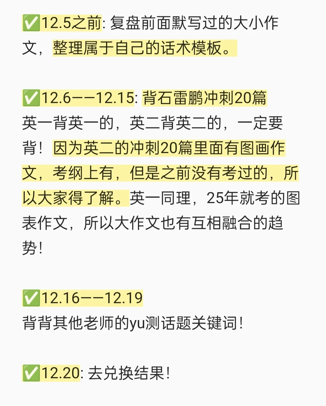 ✅12.6——12.15: 背石雷鹏冲刺20篇。英一背英一的,英二背英二的,一定要背!因为英二的冲刺20篇里面有图画作文,考纲上有,但是之前没有考过的,所以大家得了解。25年就考的图表作文,所以大作文也有互相融合的趋势!