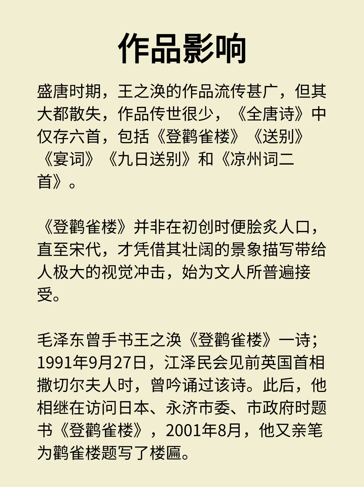 👉开元十四年(726年),他以门子调补冀州衡水主簿,而作《宴词》《送别》等诗。做官不久后,他受人诬谤,拂衣去官。此后,王之涣在居家十五年间,游历鹤雀楼而作《登鹤雀楼》,远游边塞期间作《凉州词二首》,与高适、王昌龄等人联唱迭和,留下旗亭画壁的典故。