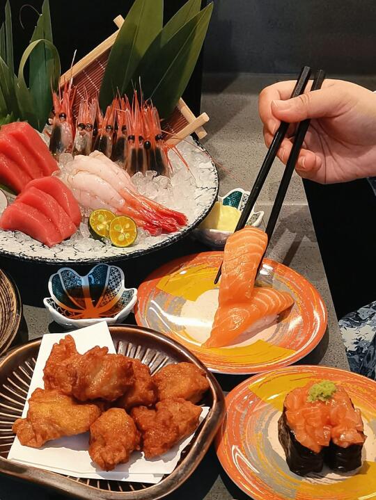 三文鱼挺厚实的,吃上去鲜嫩无比,一口一个整个嘴塞满,真的好满足!😋和我之前在北海道吃到的一模一样!
