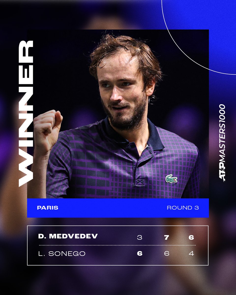 ATPTour(网球)报道。丹尼尔·梅德韦杰夫逆转获胜!丹尼尔·梅德韦杰夫逆转击败洛伦佐·索尼戈,成功晋级#RolexParisMasters(巴黎大师赛)四分之一决赛
