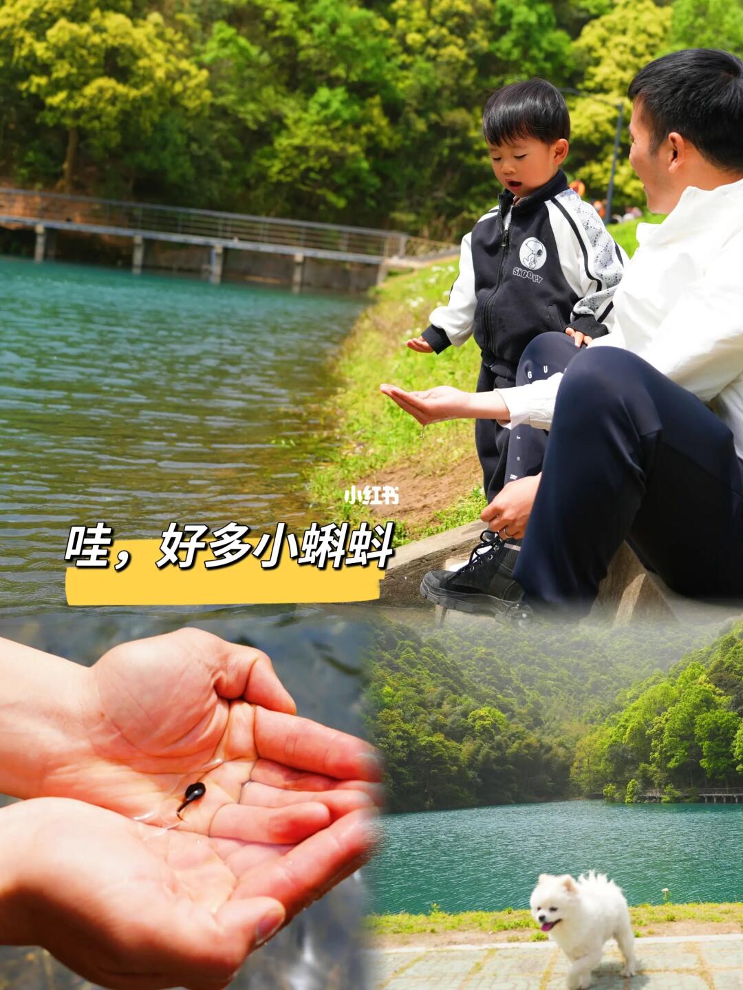 水库里有很多小蝌蚪,多宝第一次摸小蝌蚪,把他高兴坏了[哇R]水库里还有鱼,适合带娃来踏青