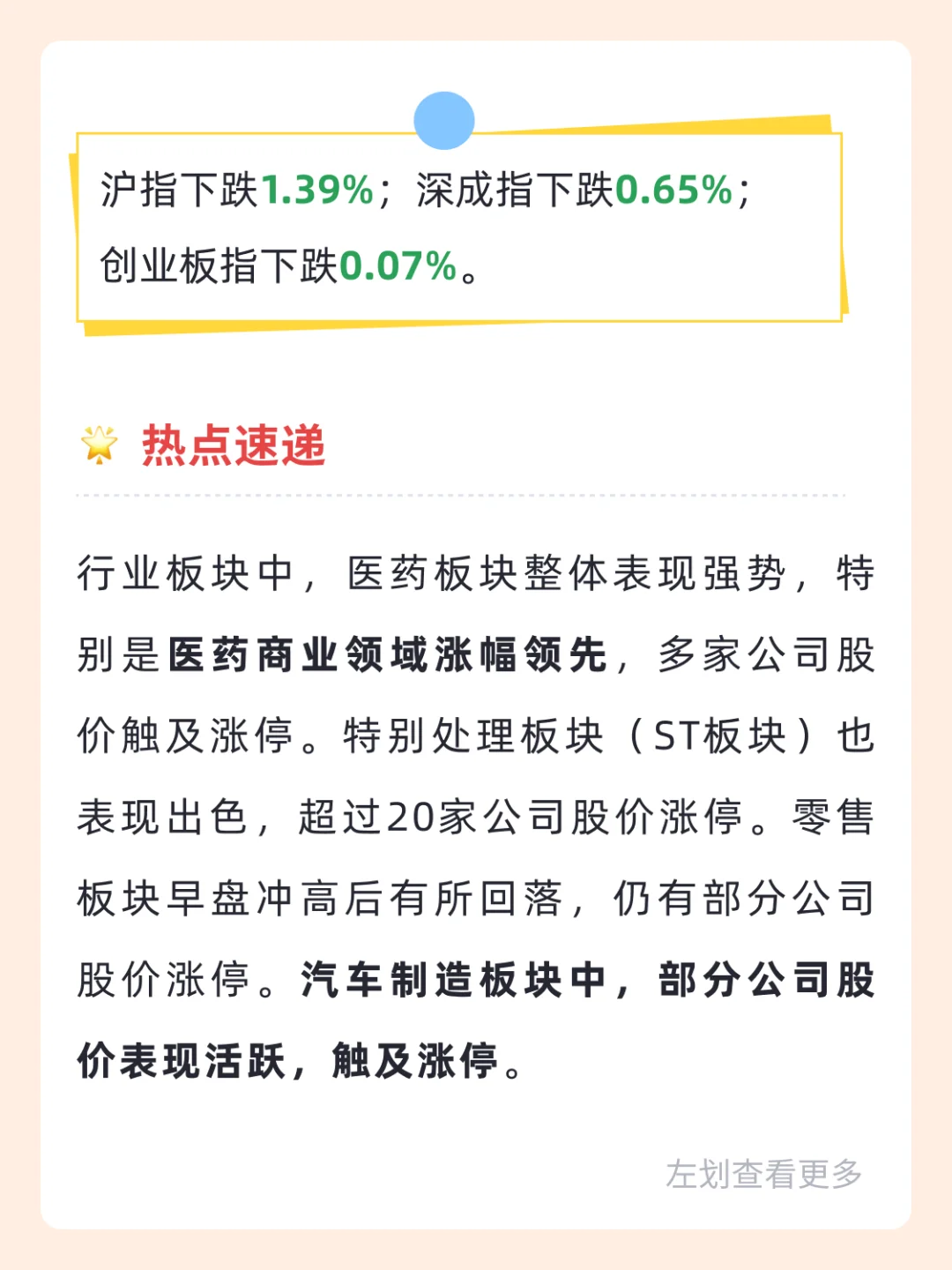 👉行业板块中,医药板块整体表现强势,特别是医药商业领域涨幅领先,多家公司股价触及涨停。特别处理板块(ST板块)也表现出色,超过20家公司股价涨停。零售板块早盘冲高后有所回落,仍有部分公司股价涨停。汽车制造板块中,部分公司股价表现活跃,触及涨停。
