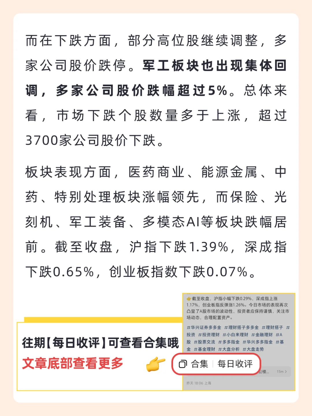 👉而在下跌方面,部分高位股继续调整,多家公司股价跌停。军工板块也出现集体回调,多家公司股价跌幅超过5%。总体来看,市场下跌个股数量多于上涨,超过3700家公司股价下跌。