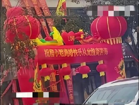 10月30日,湖南益阳一家餐馆门口,竖着一个红色拱门,拱门上拉着一条横福“祝詹小姐离婚快乐从此脱离苦海”。当事人称,她并没有操办离婚宴,是朋友操办的,她事先并不知情,只有一桌,十来个人,也没有收礼。 哈哈!现在离婚也这么高调吗?这朋友操心操的也够大的,[捂脸]离婚快乐,从此可以追求自己向往的自由了。不过,这种行为真的不提倡,没这些朋友估计还离不了婚,走进的婚姻的殿堂,彼此好好经营,好好珍惜最重要。