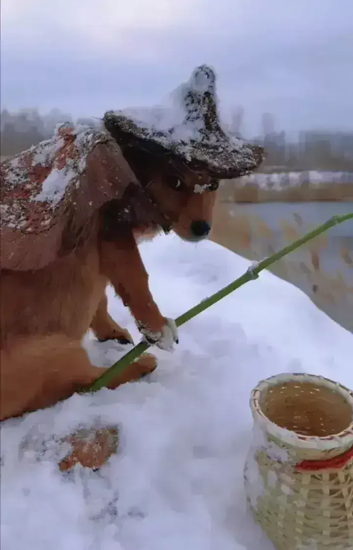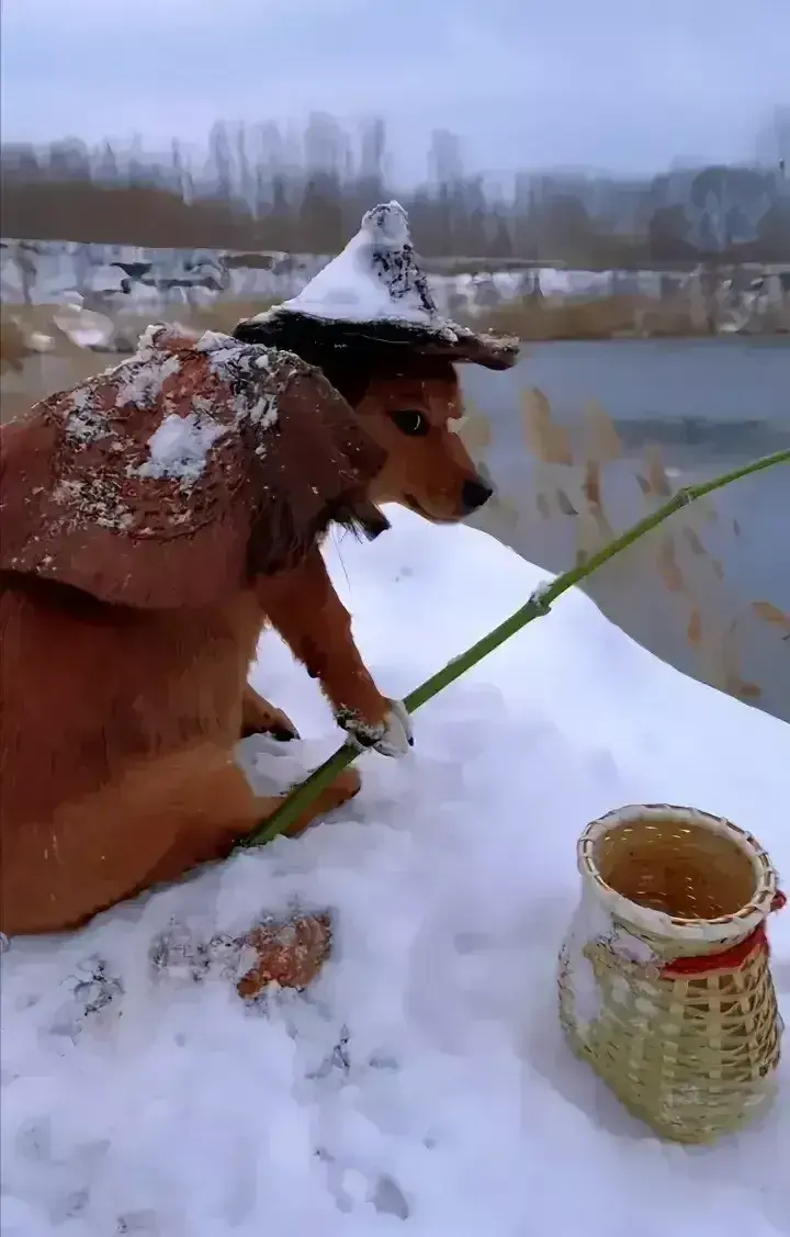 大雪纷飞的天气里,一只狗狗独坐塘边,为慵懒的主人钓鱼。