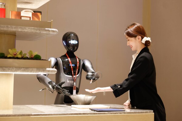 擎朗人形具身服务机器人XMAN-R1提供欢迎礼