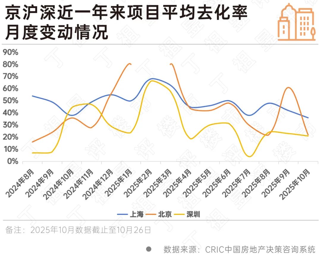 从新政前后京沪深项目去化率变动情况来看,上海、深圳呈下行趋势。上海近一年高位在2025年2月,达68%,至2025年7月降至38%,新政月8月升至48%,截至10月前26日去化率降至36%。深圳近一年也在2025年2月,达66%,最低位在7月,为4%,8-9月出现回升,截至10月前26日去化率降至21%。