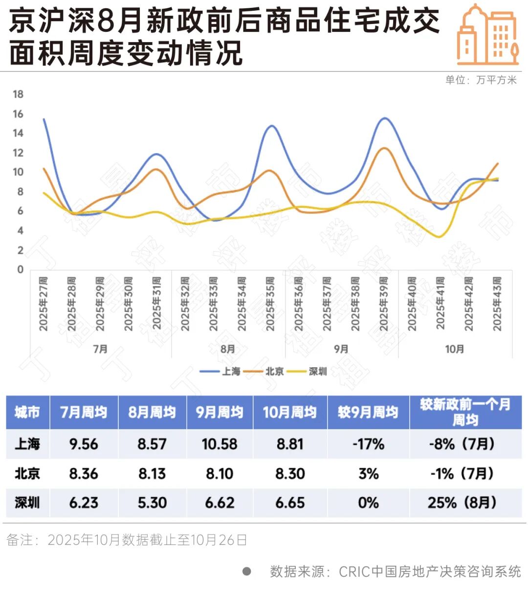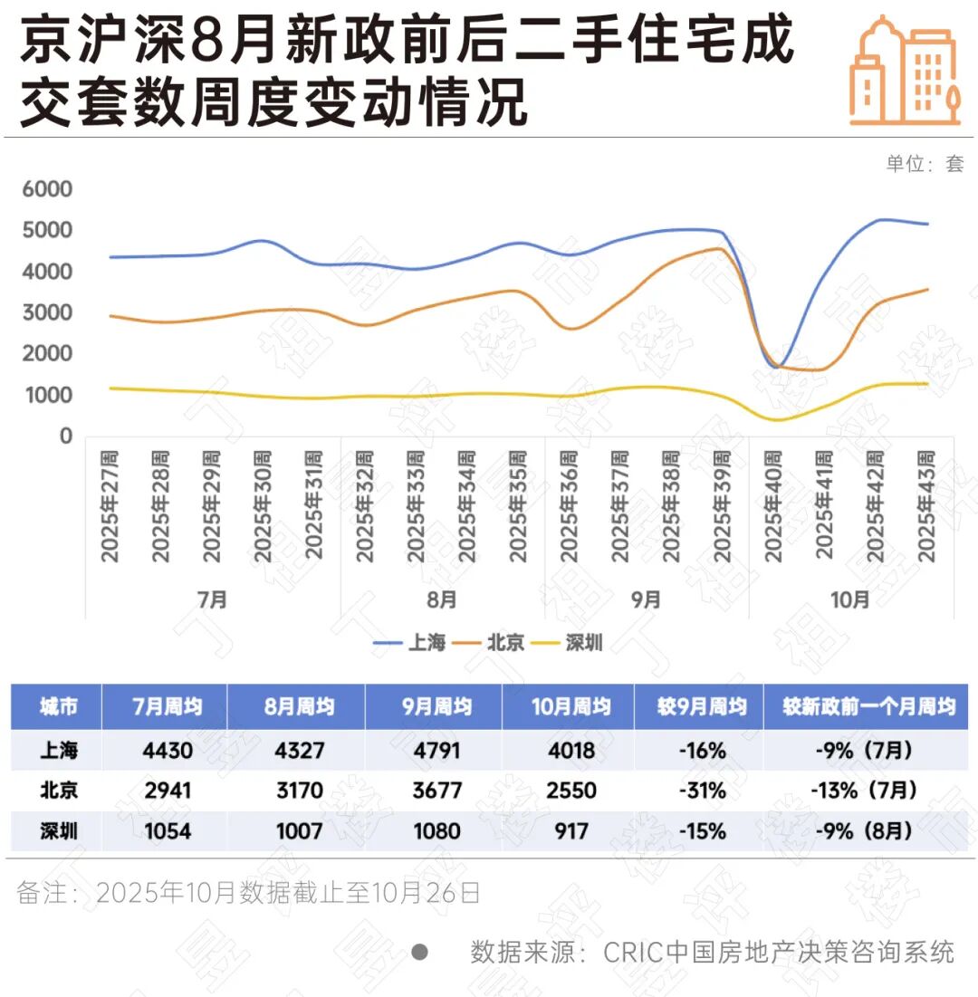 从二手房成交变动来看,新政效应减退更为显著,京沪深10月周均成交较9月周均均出现不同程度回落,与新政前一个月周均成交相比也出现了稳步下滑。