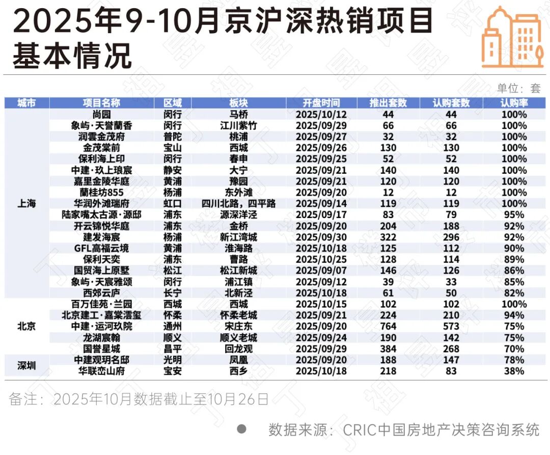 从9-10月京沪深三城热销项目来看,热销盘除了主要集中在各城市供应稀缺核心区域的改善盘之外,还有部分折扣力度较大的刚需盘,居民购房更多会权衡区位配套、产品、价格等综合因素,强调极致性价比。